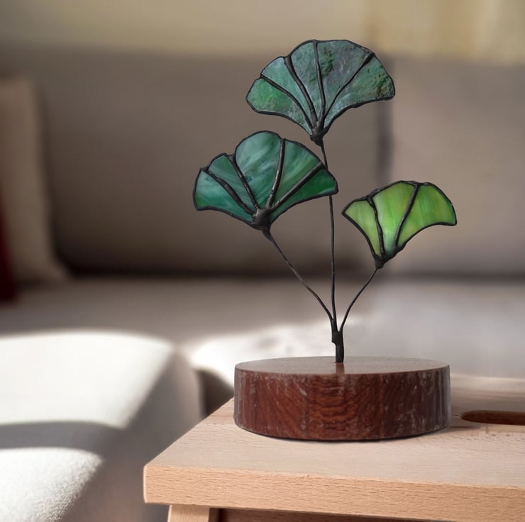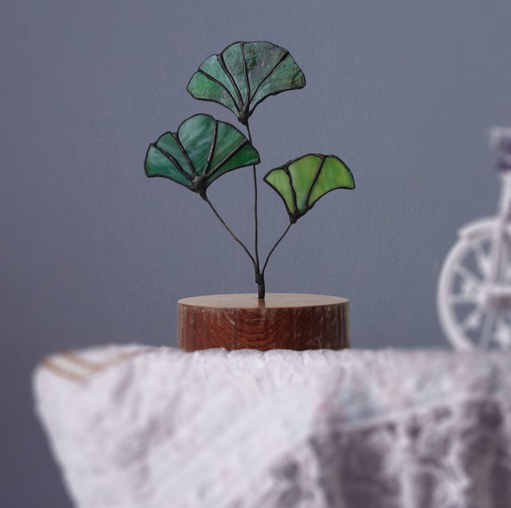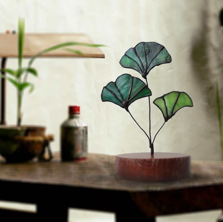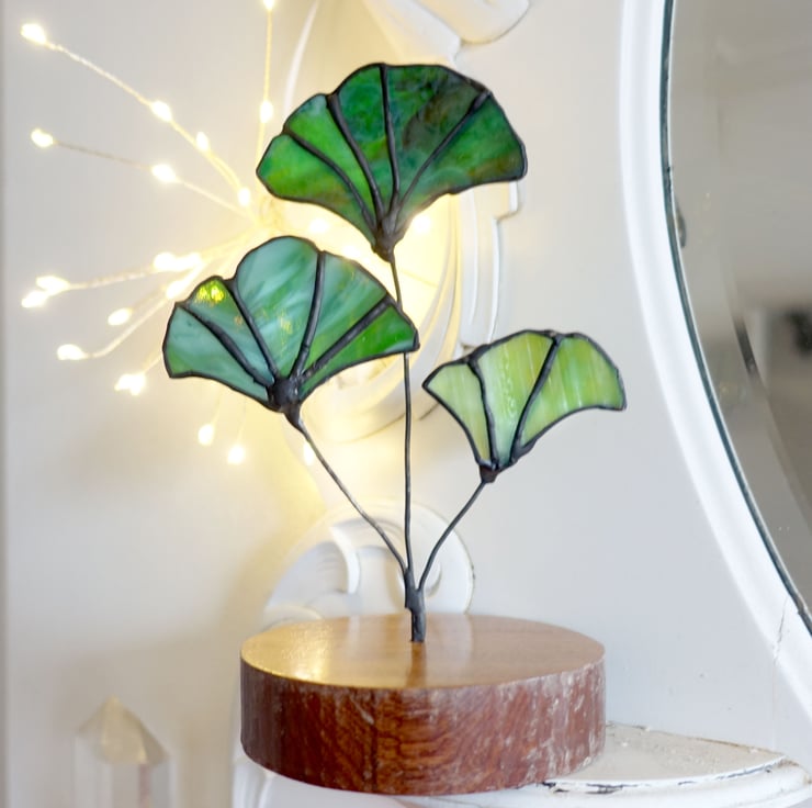 A trio of Ginkgo leaves entwined and set on a base of solid Sapele wood. The leaves are made from rare vintage Uroboros ring mottle and streaky glass, then finished with black patina that has been coated with liquid wax to maintain shine and inhibit tarnishing