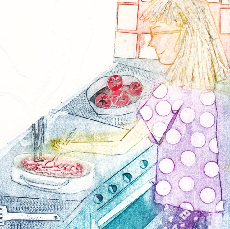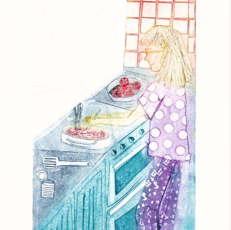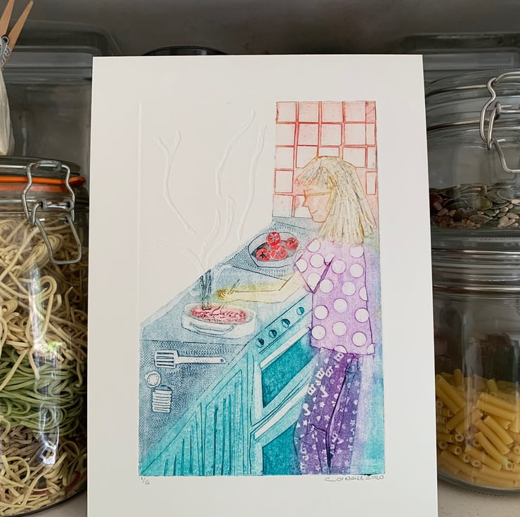 A collagraph print with the addition of embossing to indicate steam rising from the pan. A naive style print. The Tomatoes have been handprinted to give a little bit more definition.