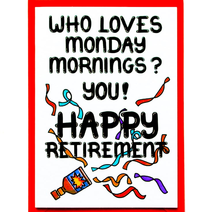 Greeting on front: WHO LOVES MONDAY MORNINGS? YOU! HAPPY RETIREMENT