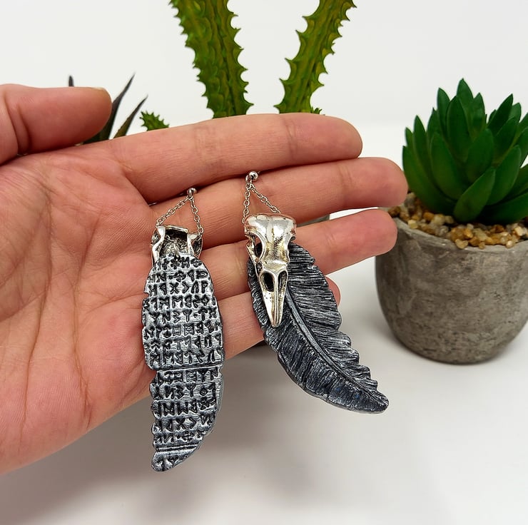 Huginn & Muninn old Norse Viking mythology inspired bird skull and feather statement earrings with chain detail, embossed runes and silver tone 304 stainless steel ear wires.
