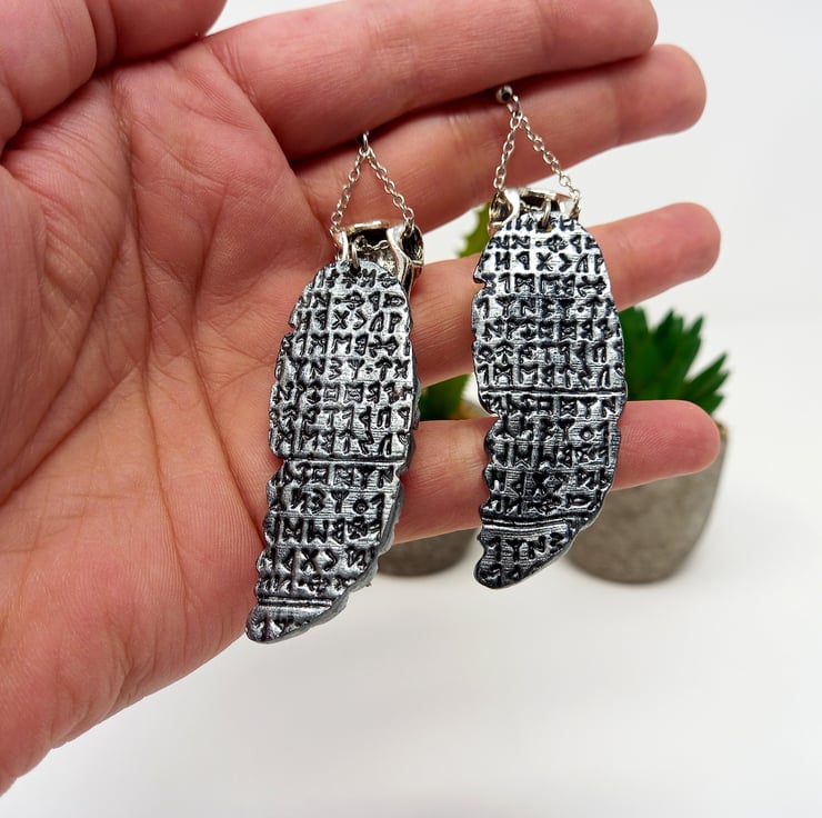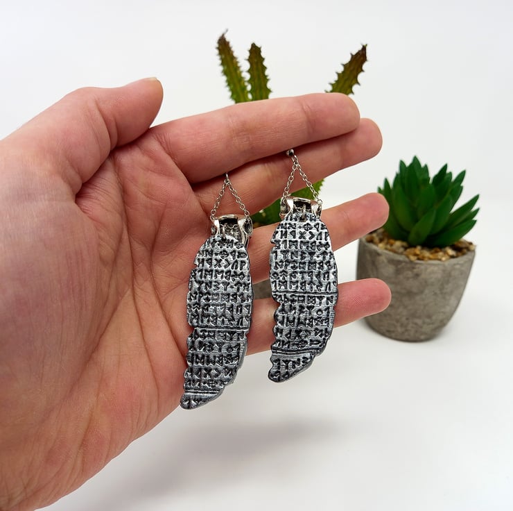 Large polymer clay feather with embossed Elder Futhark rune print