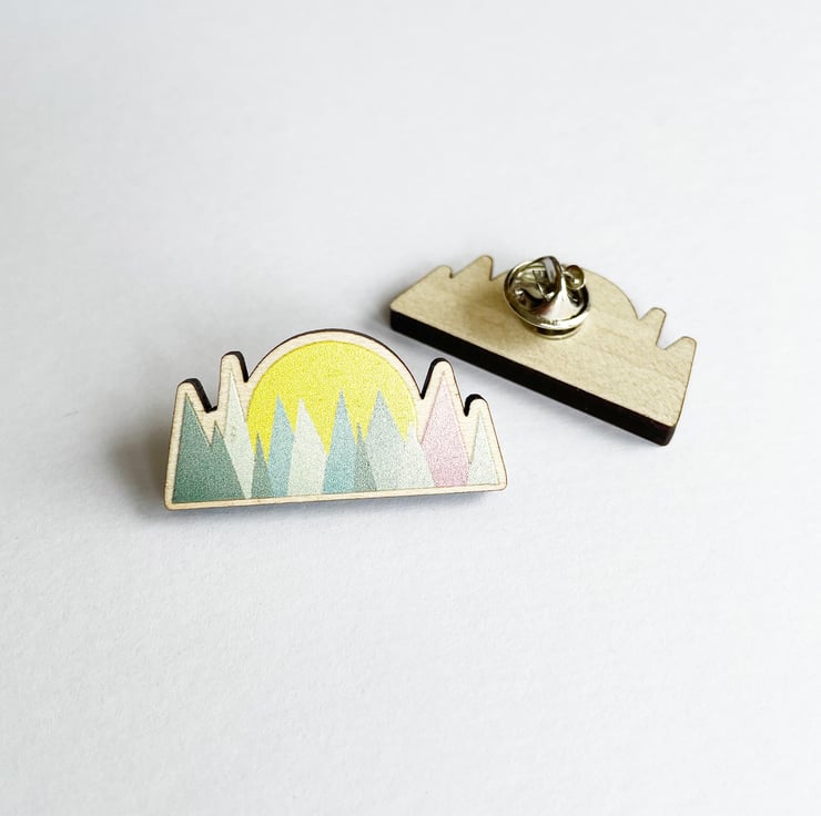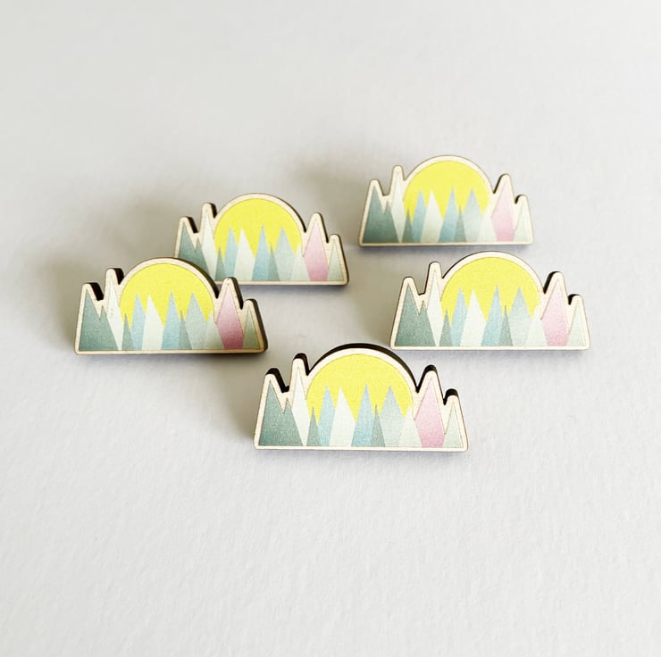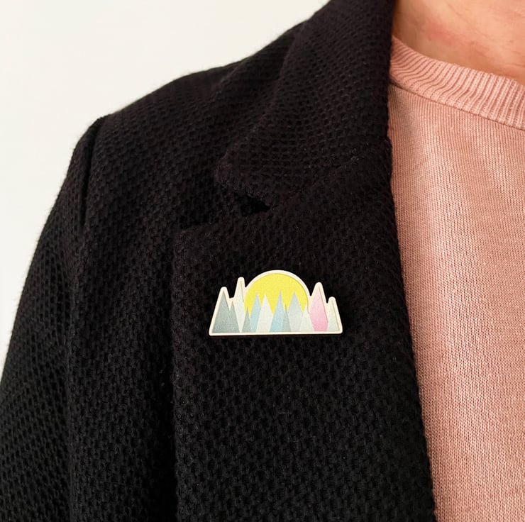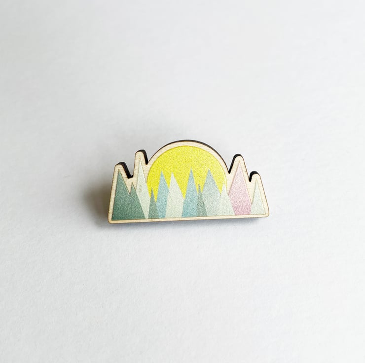 A beautiful mountain brooch with a light yellow setting sun, ready to liven up your top or coat.