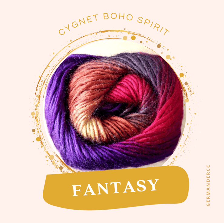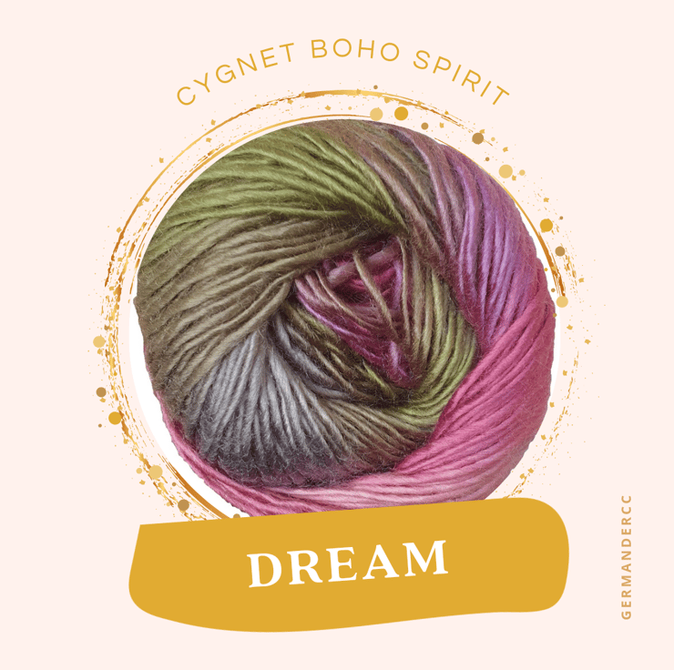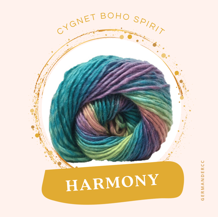 Cygnet boho spirit is a self striping, 100% acrylic, worsted weight yarn. It is incredibly soft, wearable, sleek and versatile. I use a lot of this yarn for my designs as it is affordable, washable and available in a range of fantastic colours.