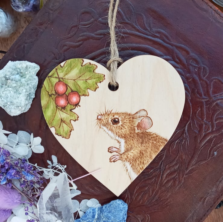 This little mouse has been created using pyrography, which is burning on wood, and coloured with artists acrylic ink. It's sealed with artists varnish.
