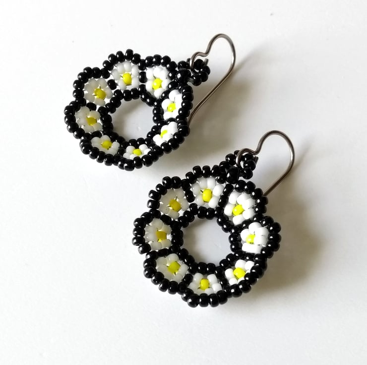 Inspired by daisies, these seed bead earrings have been hand-woven with just a needle and thread - perfect for summer days!