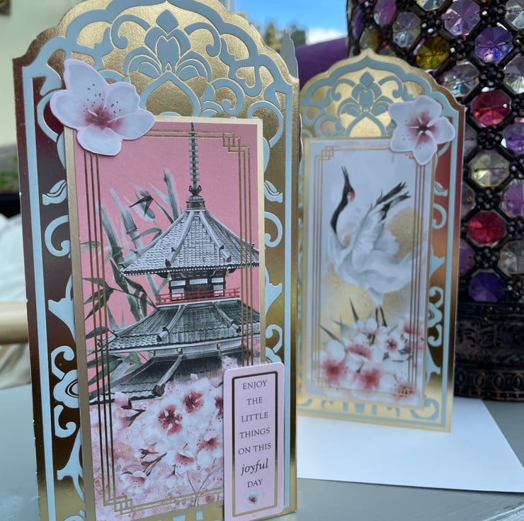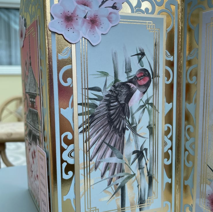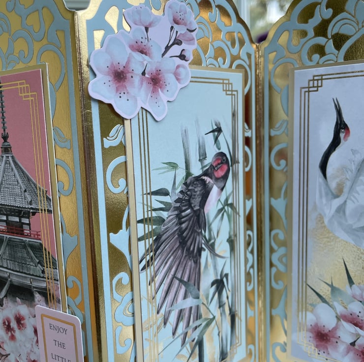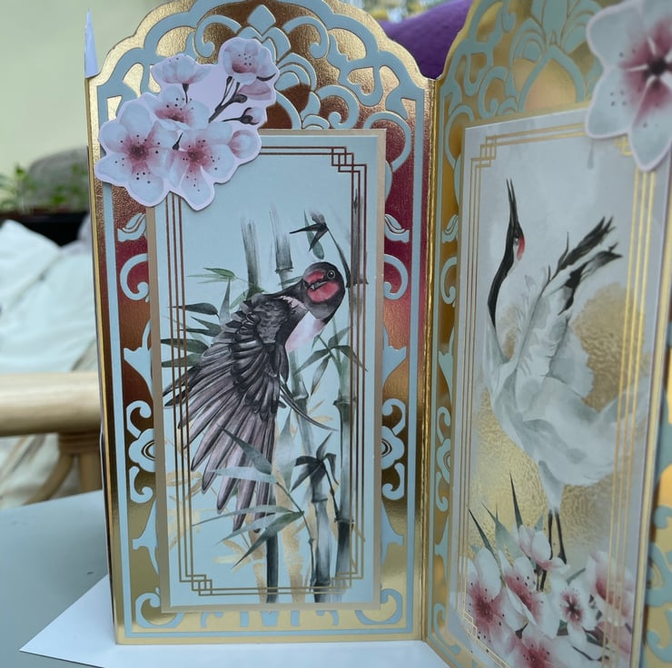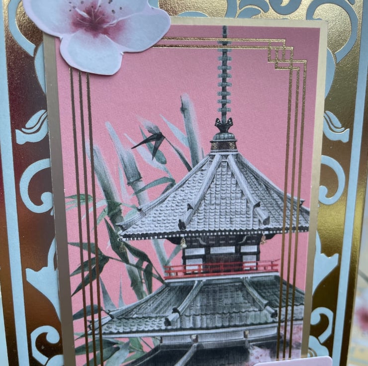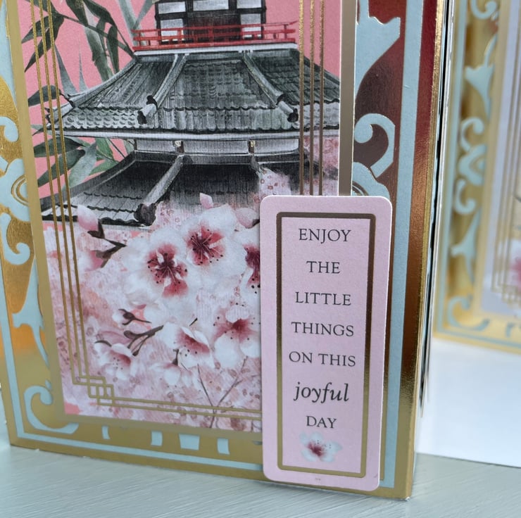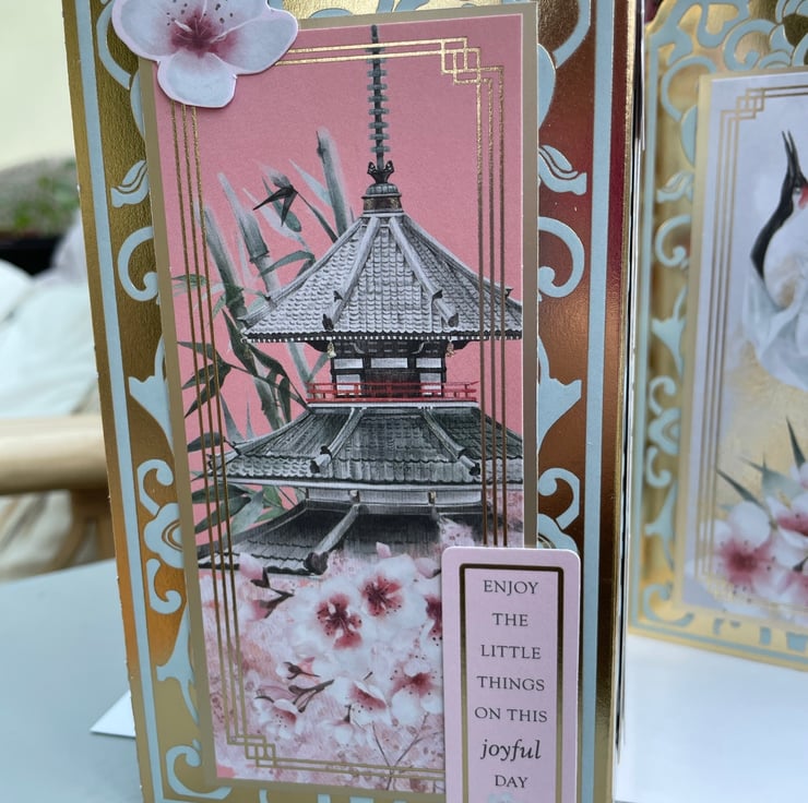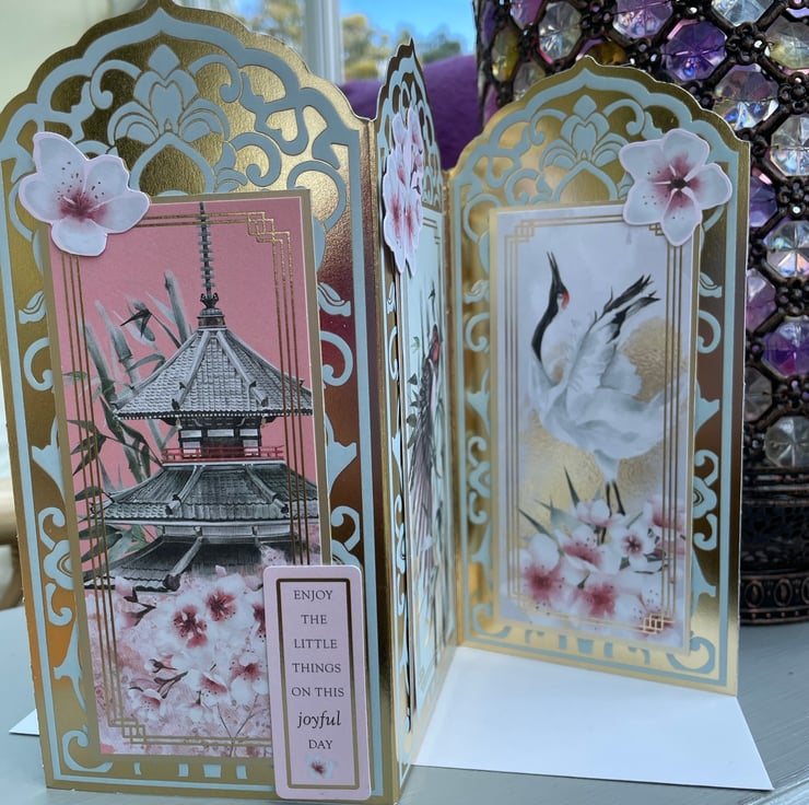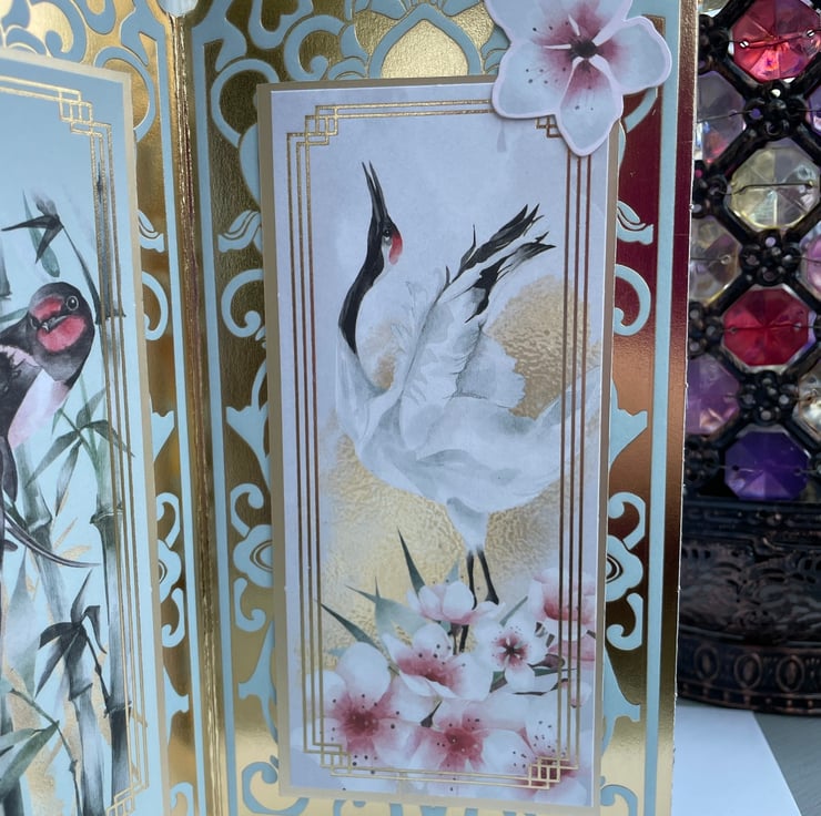 A beautiful and intricate embossed Japanese inspired card for many occations. This DL sized shaped card is unusual and is like a fancy screen. The main card base is gold and aqua in colour and features fancy scrolls and a shaped top. There are 3 panels and each features a different Japanese picture. The front of the card has a pergoda design and features cherry blossom and bamboo. The greeting says Enjoy the little things on this joyful day. There is a single cherry blossom that completes the design. The middle panel has a swallow perched on bamboo, a spray of cherry blossom finishes the panel. The final panel has a crane and cherry blossom plus a sinle cherry blossom to finish. The back is plain with plenty of room for your own greeting. A beautiful card for many occations including a birthday, anniversay, it's up to you.