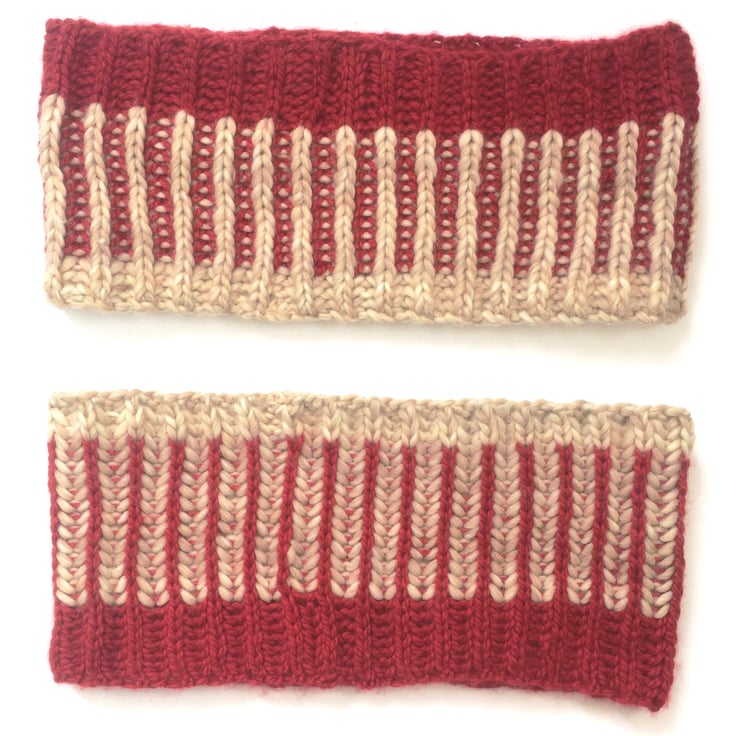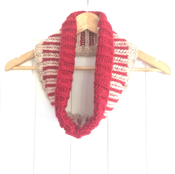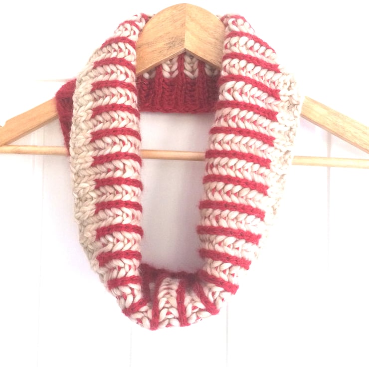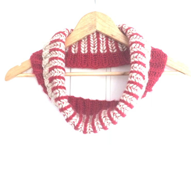 Beautifully soft striped cowl measuring - circumference 28 inch / 70 cm and the depth is 7 inch / 17 cm . It has been knitted in a stunning red yarn (60% baby alpaca, 30% Merino wool, 10% silk) and a 100% cream wool yarn. It's totally reversible and knitted in the round so there are no seams. The last photo shows both sides of the cowl, how it one edge in red and the other in cream and striped brioche knitting in between.