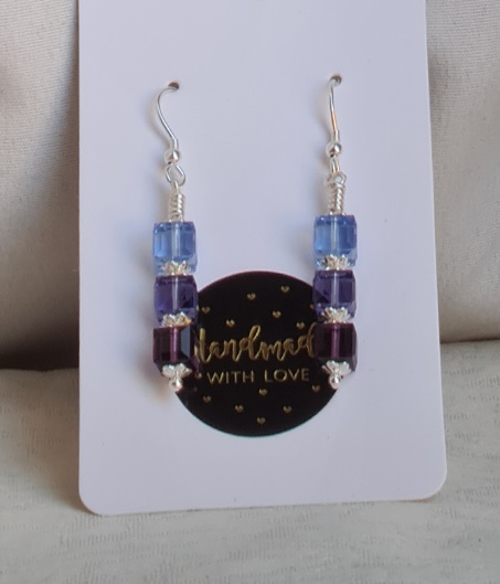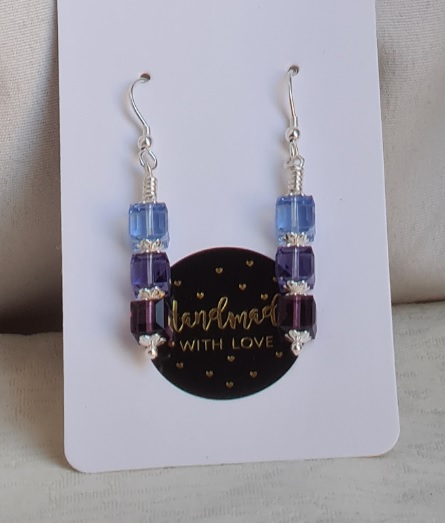 Crystal cubes are 6mm and are in colours Light Sapphire (Blue), Tanzanite (Purple) and Amethyst (Red-Purple). All metal components are Sterling Silver.