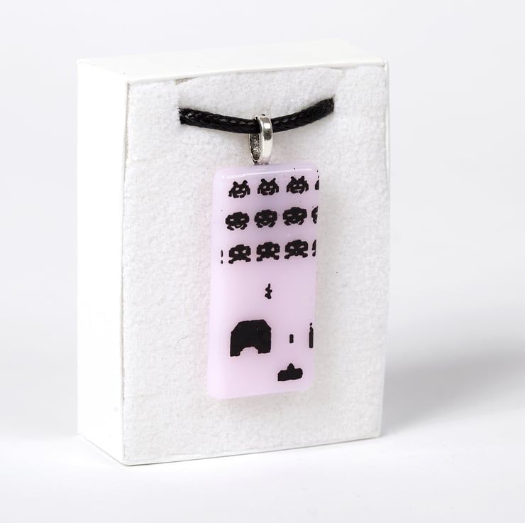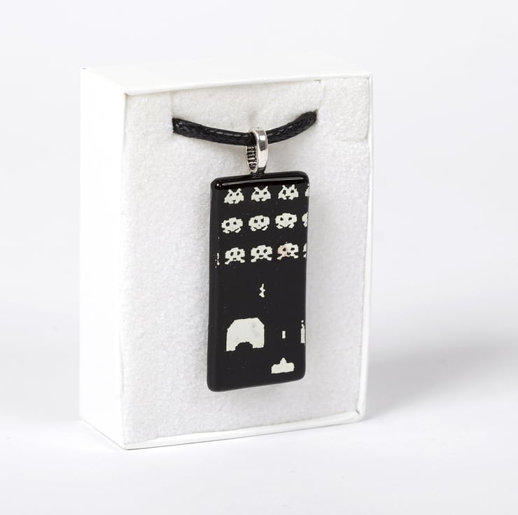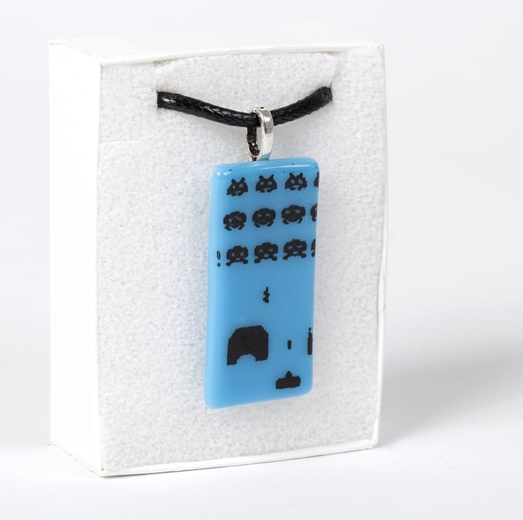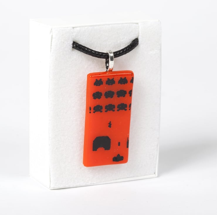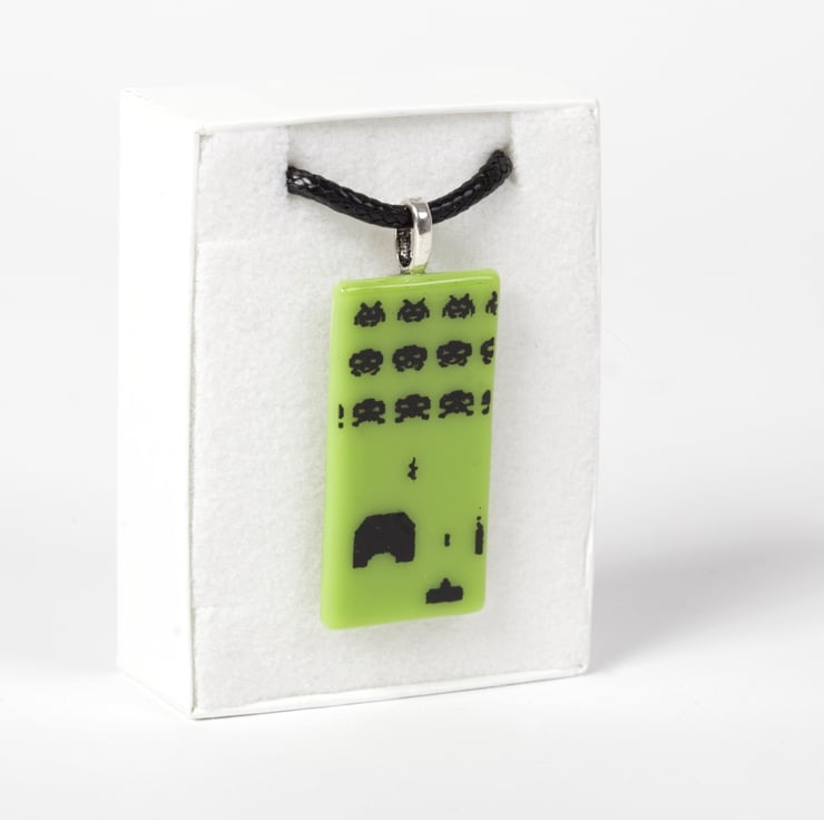 This pendant is inspired by the original arcade game, Space Invaders that I remember playing on my Amiga back in the 1980s. Although I have only made the limited neon colours from the game in glass jewellery, I have a rainbow choice of coloured flat glass in the studio and they design could be made in any glass enamel colour too.