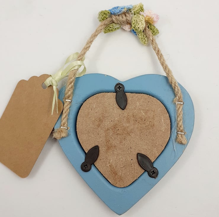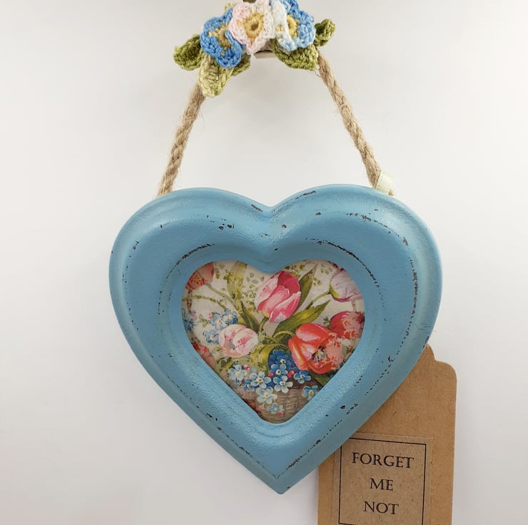 This pretty frame is one of a trio of brand new painted wooden frames that I have reworked and decorated with my tiny crochet forget-me-nots. The frame itself measures approximately 9 cm long by 9 5 cm at its widest point. The flowers and leaves are crocheted in cotton and glued in place at the top of the hanging loop. The tag reads 'Forget Me Not' and the frame comes wrapped in tissue in a labelled PIP ( Postage in Proportion) box all ready to be given or posted on. It would make a lovely keepsake alternative to a greetings card, perfect for telling someone how much you miss them.