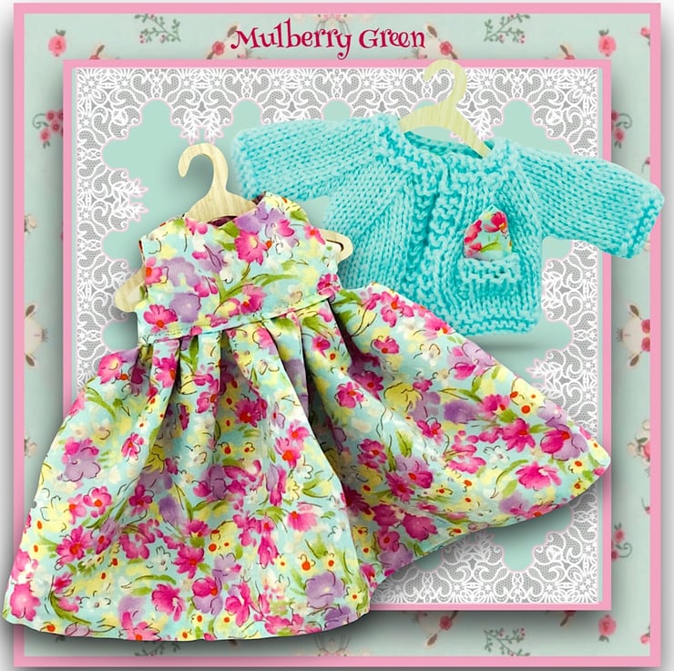 A pretty turquoise cardigan with a cute little pocket and a handkerchief to match the Spring Blooms dress, to fit the Mulberry Green characters. The cardigan is hand knitted and is very cute.