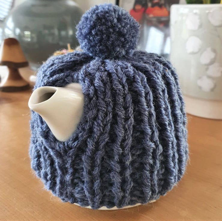 Hand knitted using double strands (two balls at the same time) of Aran weight yarn in a 1 x1 ribbed pattern, makes this cosy extra thick. It's not called a cosy for nothing!