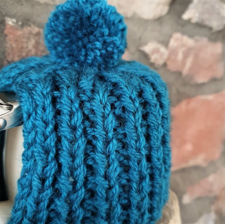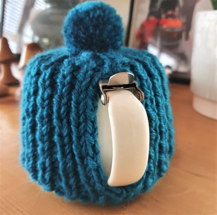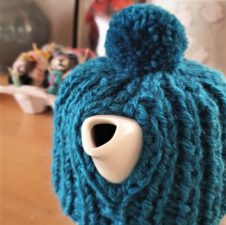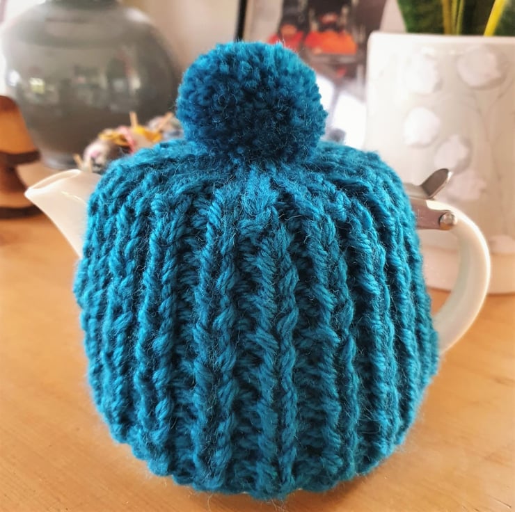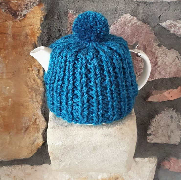 Hand knitted using double strands (two balls at the same time) of Aran weight yarn in a 1 x1 ribbed pattern, makes this cosy extra thick. It's not called a cosy for nothing!