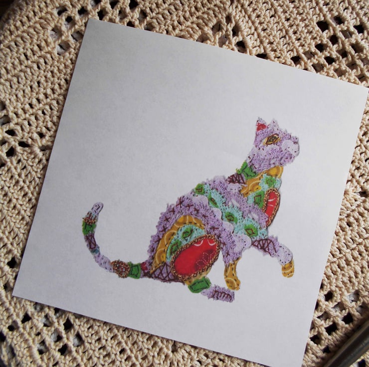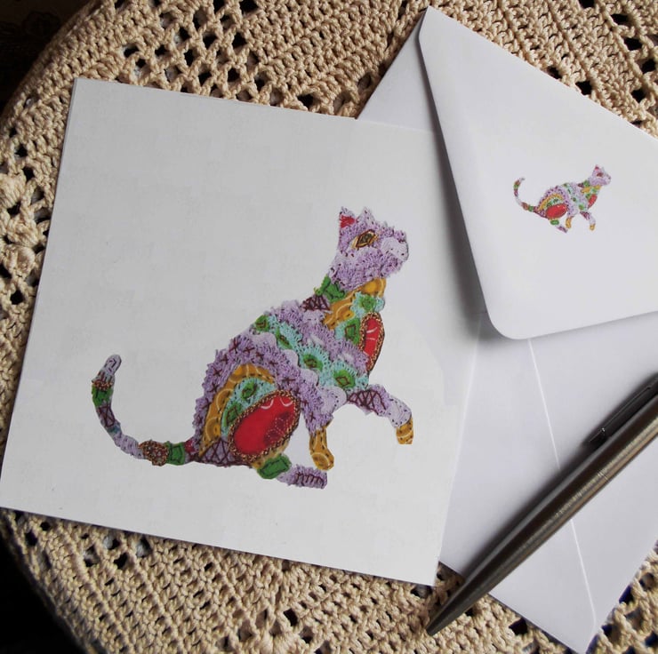 This unique 'Cat' greeting card features the scanned image of my handsewn textile artwork. The card is blank inside for your handwritten message and is perfect for any occasion.