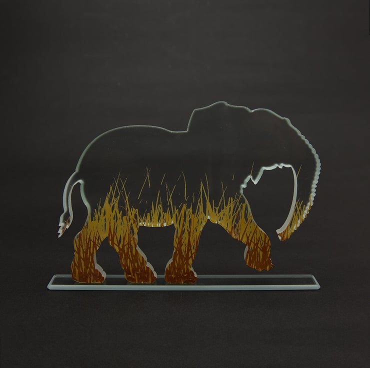 This elephant is made from one piece of chunky 10mm thick clear float glass that has been cut to shape using a water jet cutting machine.