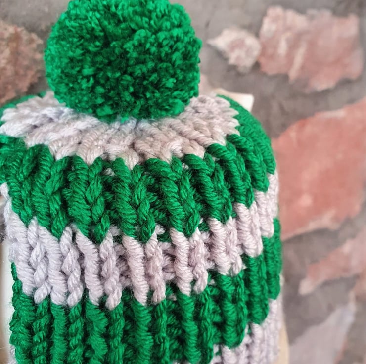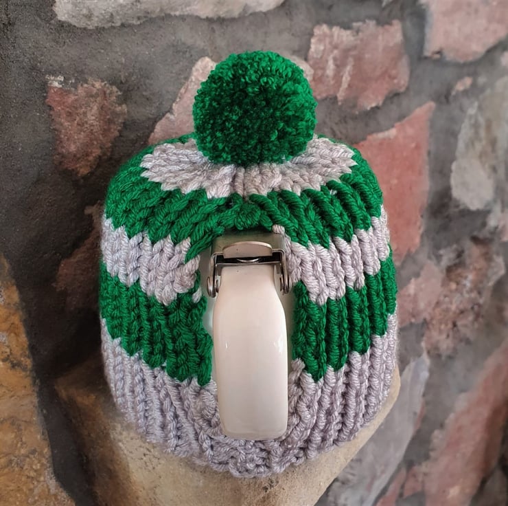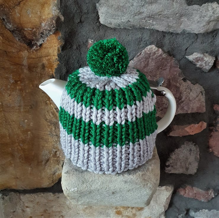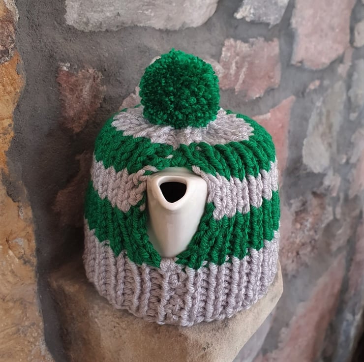 100% Acrylic, knitted using soft, chunky weight yarn in 2 x 2 rib, making this tea cosy both thick and stretchy.