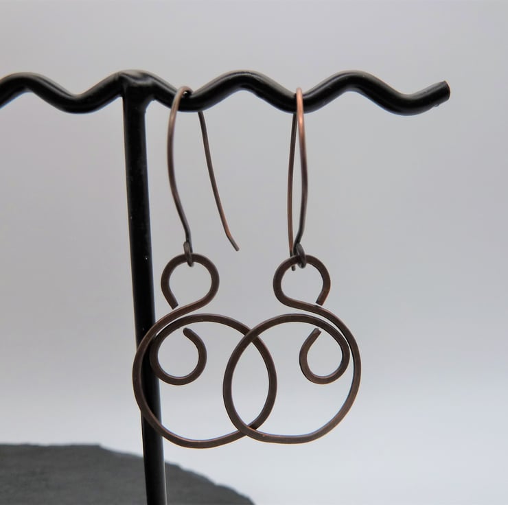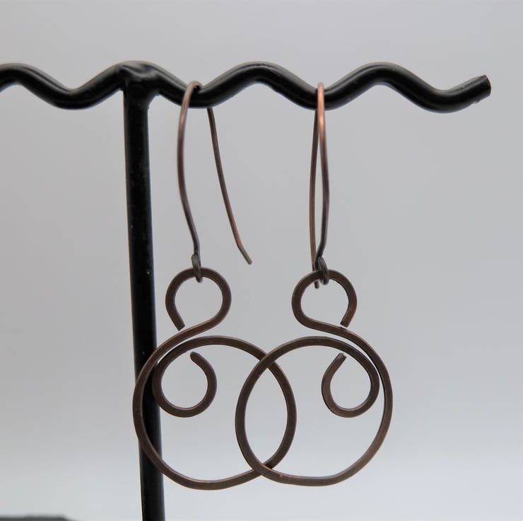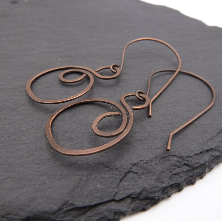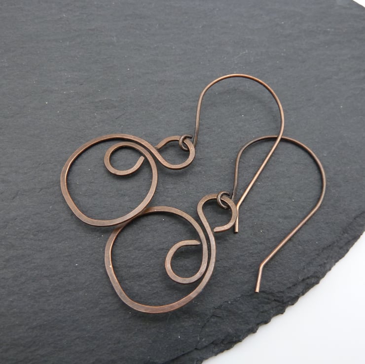 A pair of earrings made with handmade copper ear wires and handmade copper swirls.