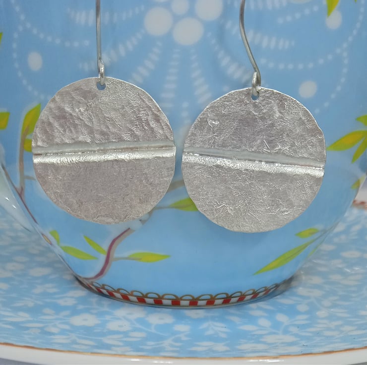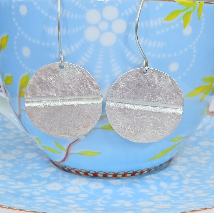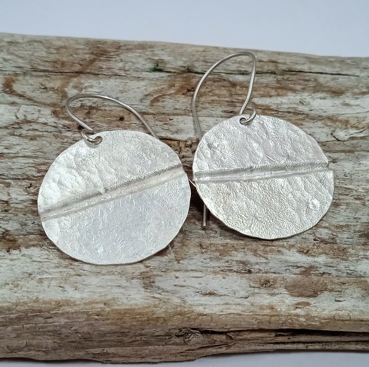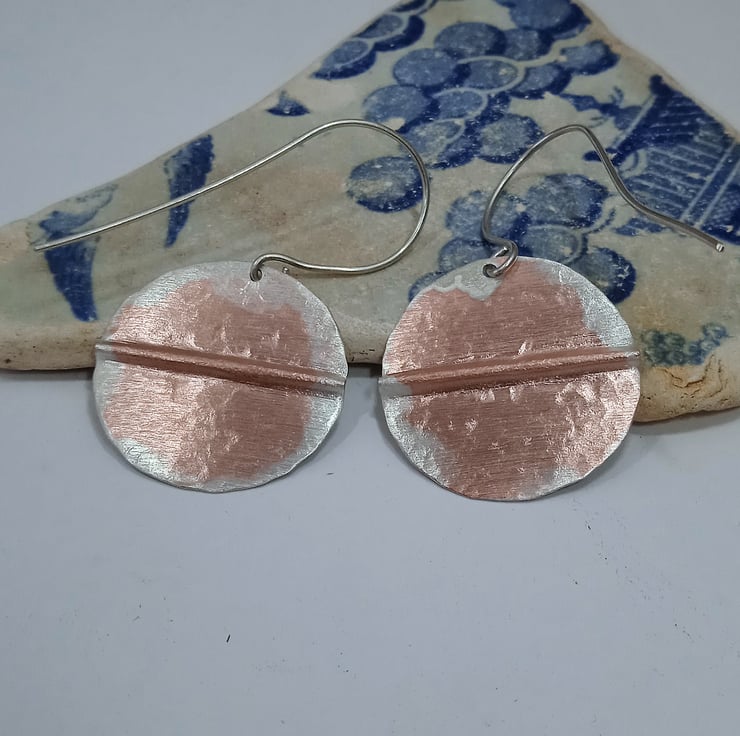 I have created these lovely earrings by cutting the discs from copper sheet before creating an interesting fold crease detail and then coating the fronts of them in melted sterling silver.