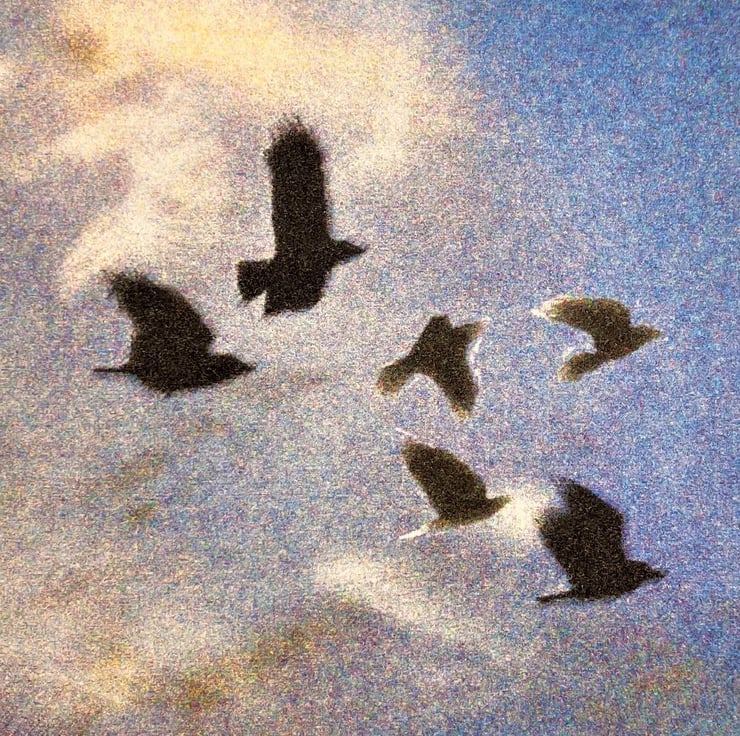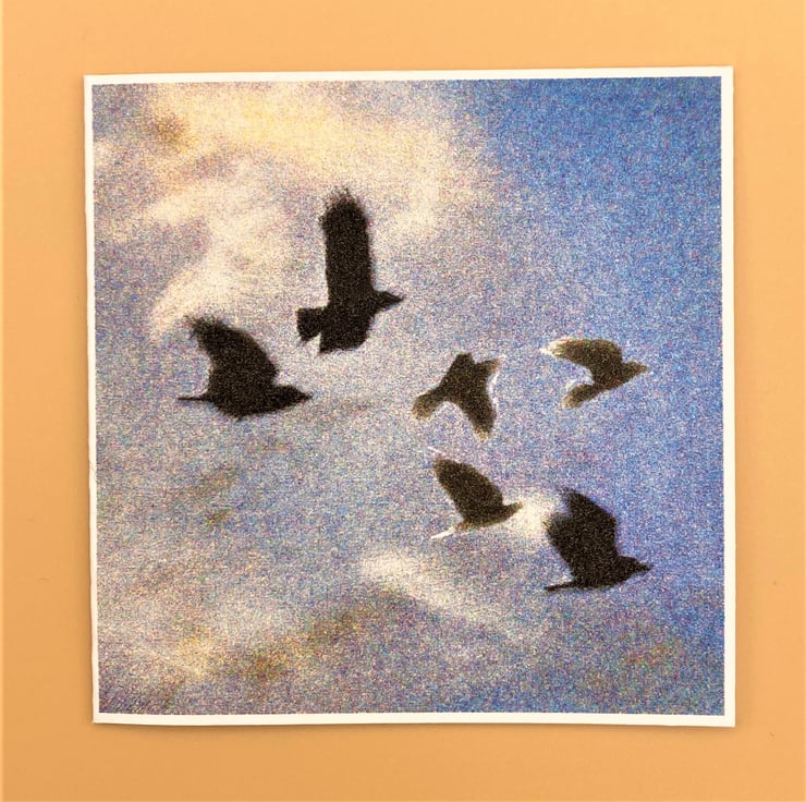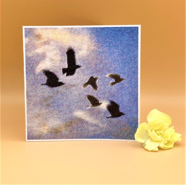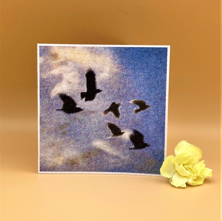 This blank Greetings Card shows Crows flying through a dusky blue evening sky - no message inside. Taken from one of my original digital paintings this little card is a charming way to send your own greetings on any occasion. The dusky blue sky with its soft evening light is a peaceful image. This card comes in several variations (see other listings) and there's also a 'best buy' value pack containing 4 all different colourways.