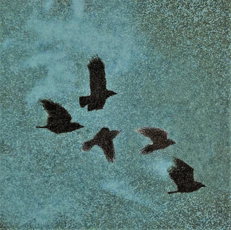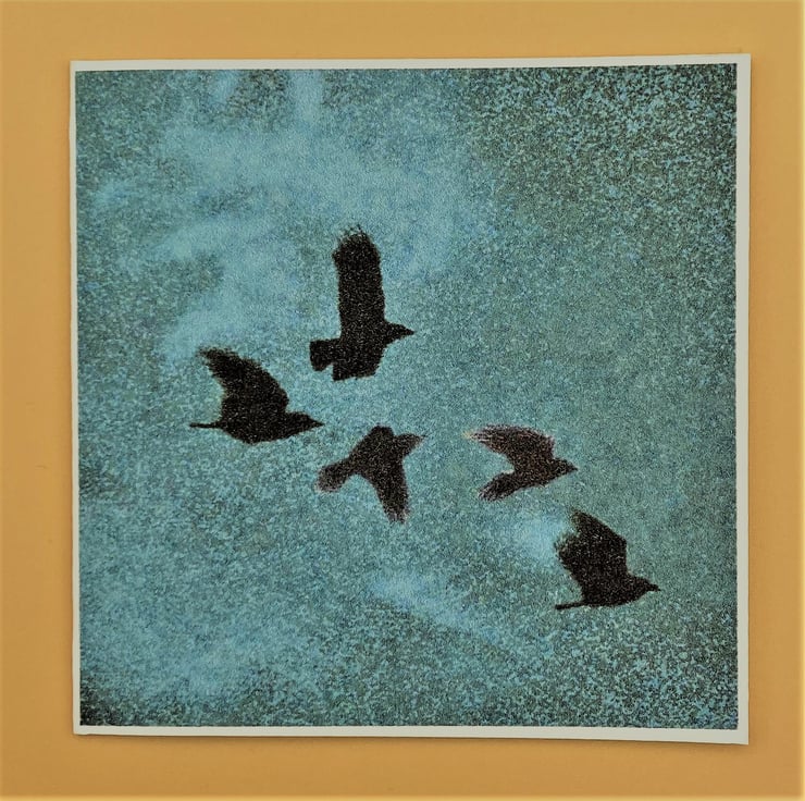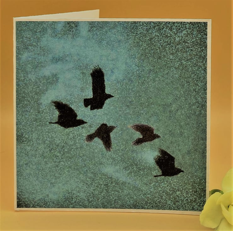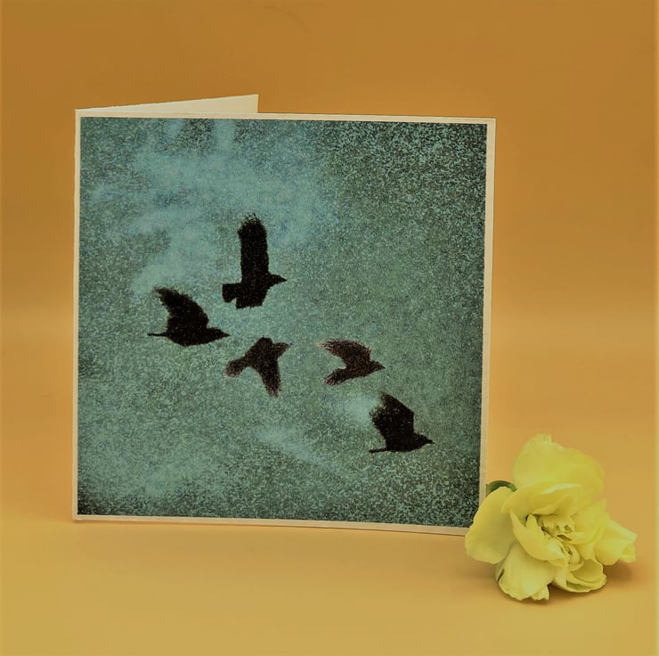 This blank Greetings Card shows Crows flying through a Turquoise evening sky - no message inside. Taken from one of my original digital paintings this little card is a charming way to send your own greetings on any occasion. The Turquoise sky has a very tropical feel. (This card also comes in several variations and there's also a 'best buy' value pack containing 4 all different colourways see other Listings for more details.)