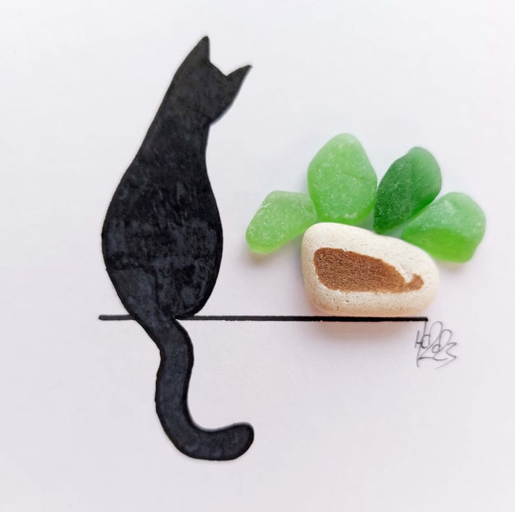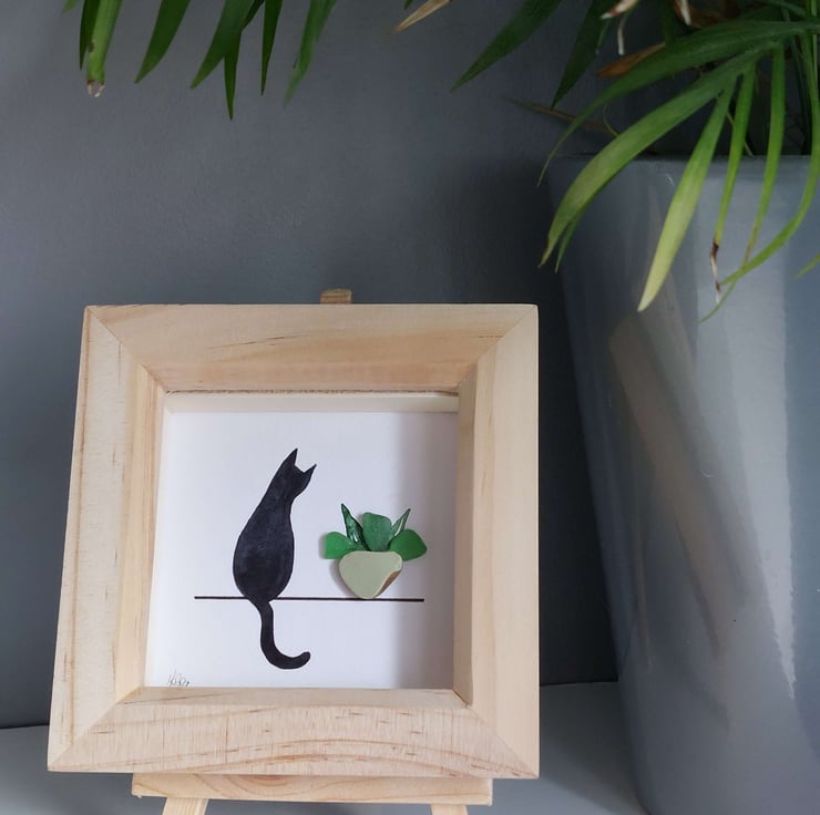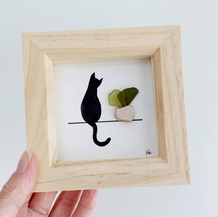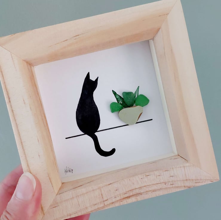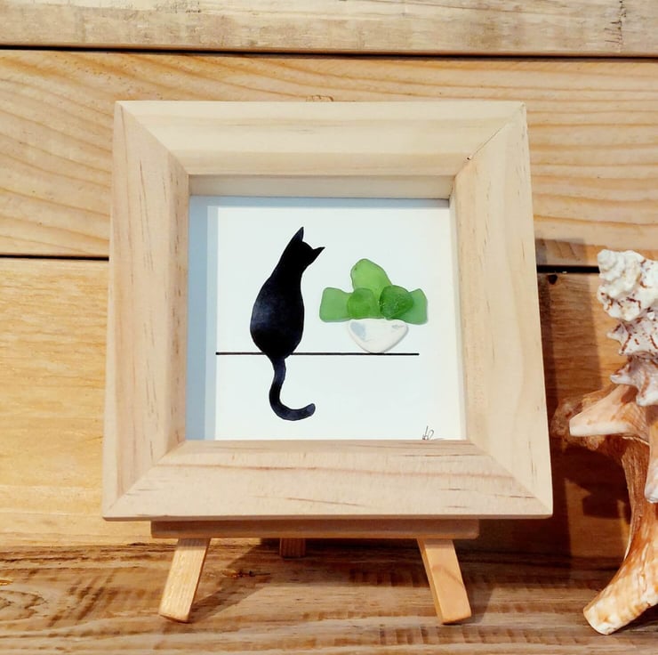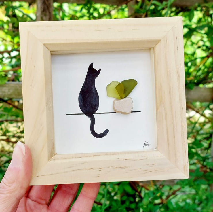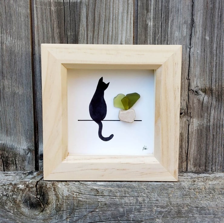 Add a touch of seaside beauty and feline charm to your space with this unique Sea Glass Cat Desk Art. Featuring a hand-painted cat perched on a ledge, this framed piece is an ideal thank-you gift for animal lovers, cat enthusiasts, or a thoughtful token of friendship. Bring a whimsical vibe to any room with this delightful artwork.