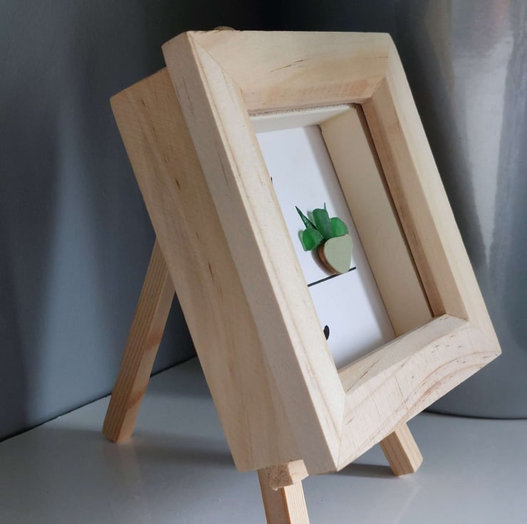 - The frame is 11.5cm square, made from wood with a hook on the reverse for wall hanging. Alternatively, add a stand to your order to display on a desk, shelf or window sill.
