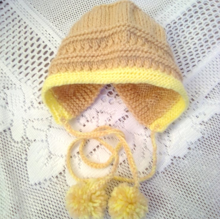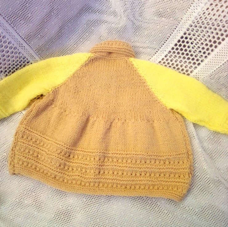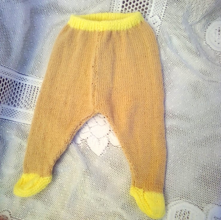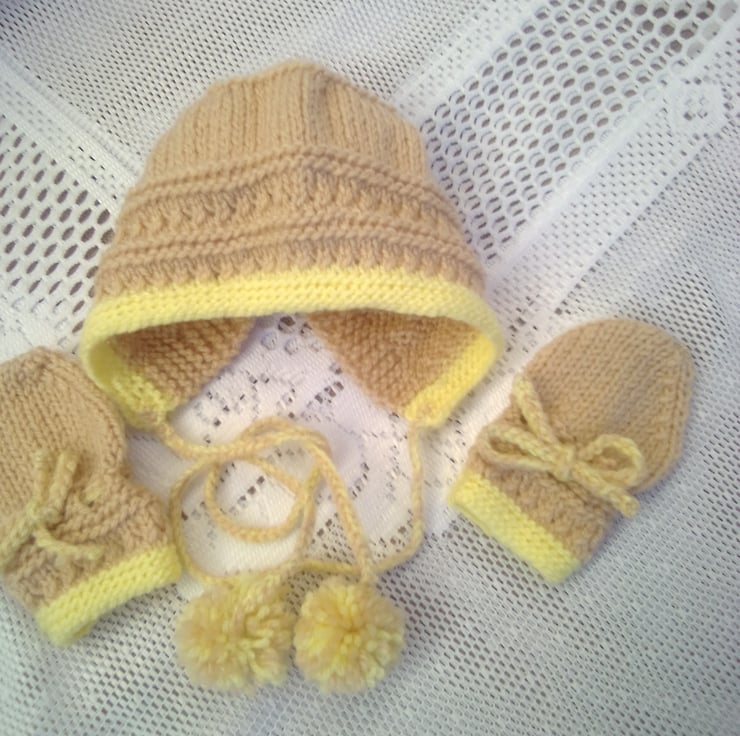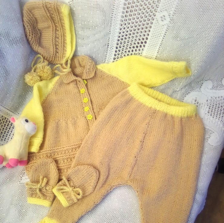 This set is in stock in a size to fit a 0 - 3 month old baby with a 16 inch chest, in the biscuit and yellow shades shown in the photos. The outfit can also be made in the size and colour of your choice (most colours are available), please see below for sizes available and state colour required when you order. The processing time will be 1 - 2 weeks to produce and post to you. It would make an ideal gift for a new born baby, a baby shower or as a Christening gift.