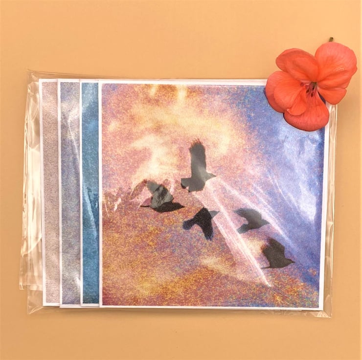 This beautiful bundle of 4 Blank Greetings Cards in 4 colour variants shows Crows Flying in an Evening Sky. Each card presents a different coloured variation of my original digital paintings. These blank cards are a charming way to send your own greetings. Colours are Rainbow , Pearl Pink , Turquoise and Dusky Blue. Buying them as a beautiful bundle 'special' rather than individually means a considerable cost saving of £2.00 over the individual price.
