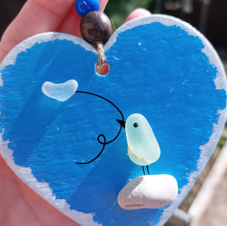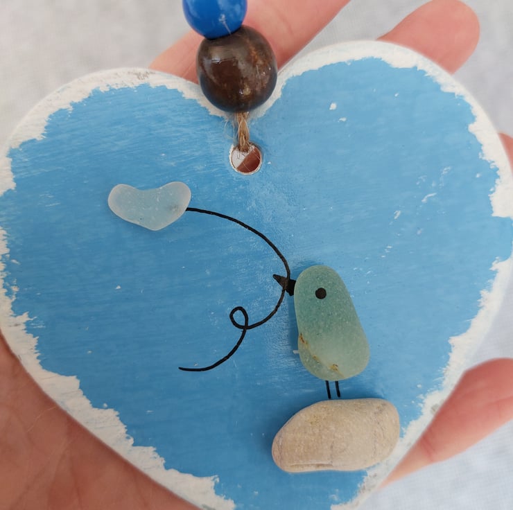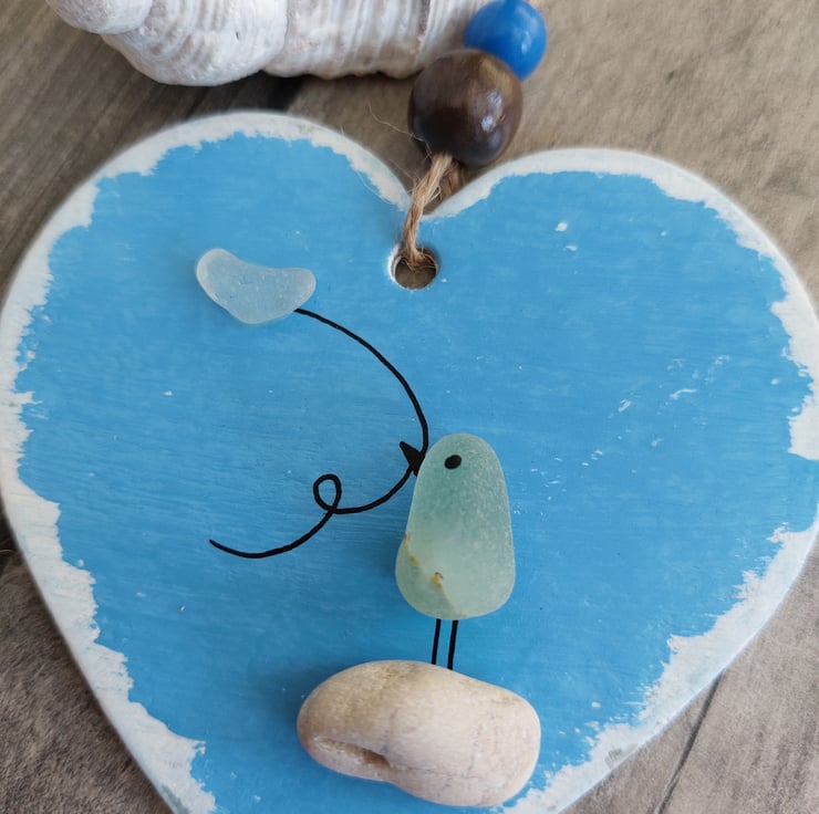 A really cute little sea glass bird holding a heart balloon and standing on a pebble. This has been made from beautiful natural coloured sea glass collected from Seaham Beach in the North East of England.
