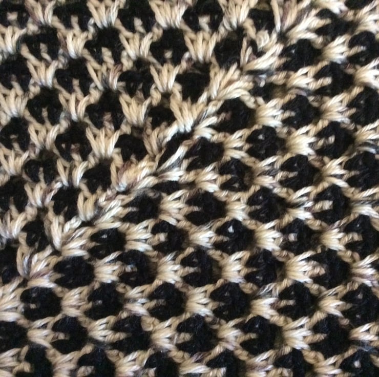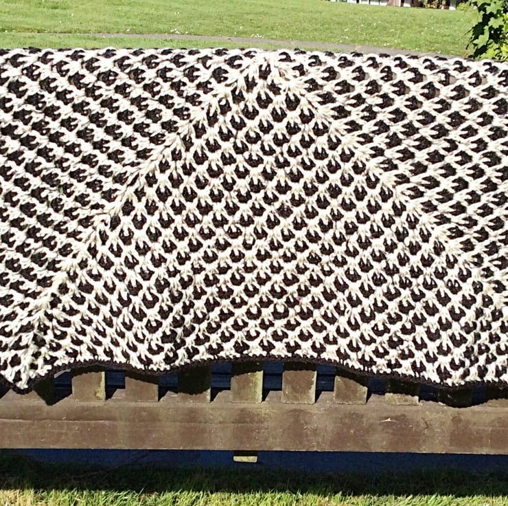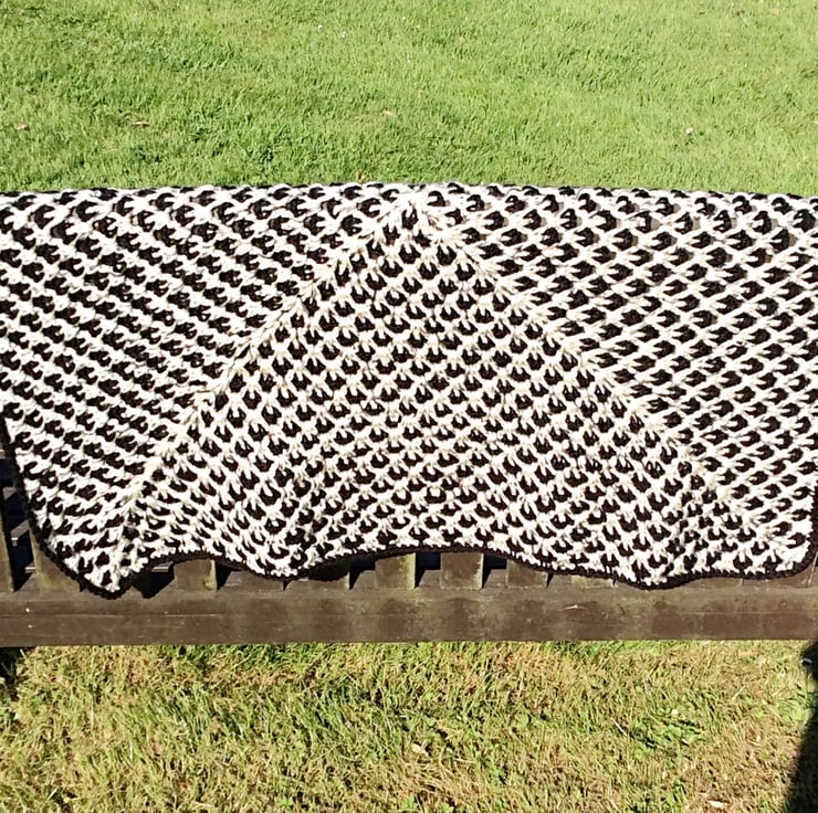 This lovely handmade crochet blanket is made using supreme Acrylic Yarn in Aran weight. It’s in black and beige with a slight fleck and is extremely warm and soft. It is 32” x 32” ( 80cm x 80cm ) so would make a great lap blanket, car seat throw, wheelchair blanket or for just popping over your knees for a warm feeling. The design is geometric crochet in a lovely pattern.