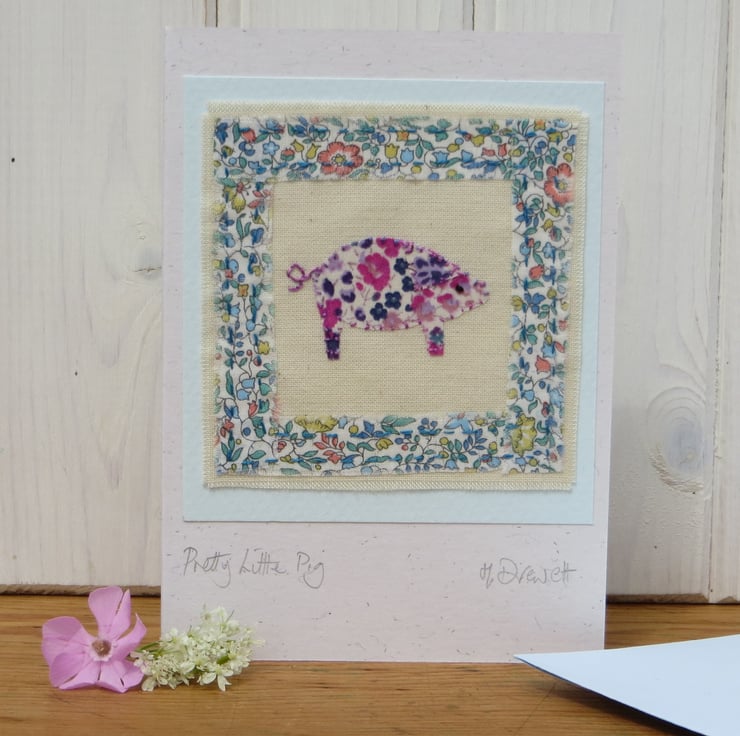This is a hand-stitched miniature textile mounted onto greeting card - a gift in itself to keep as well as a card in which to write your message. I have chosen some of my favourite Liberty Tana Lawn cotton prints for this design, adding embroidered details to the little pig applique - like her curly tail!