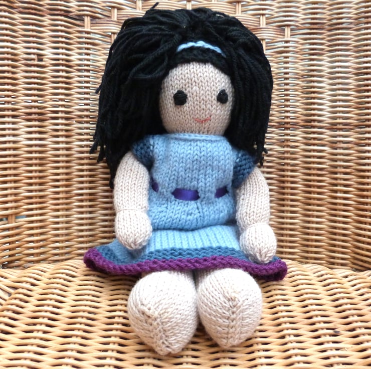 Doll. Hand Knitted Doll 12" handmade Doll Black Hair & Removable Knitted Dress