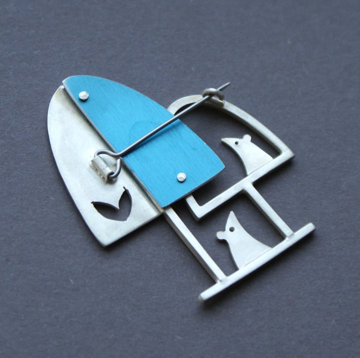 The framework is made from sterling silver square wire and silver sheet which has been textured with little circles and has a leaf cutout. The coloured piece is anodised aluminium which is blind riveted to the silver. The brooch pin is made from stainless steel as I find this provides more strength to hold it's shape.