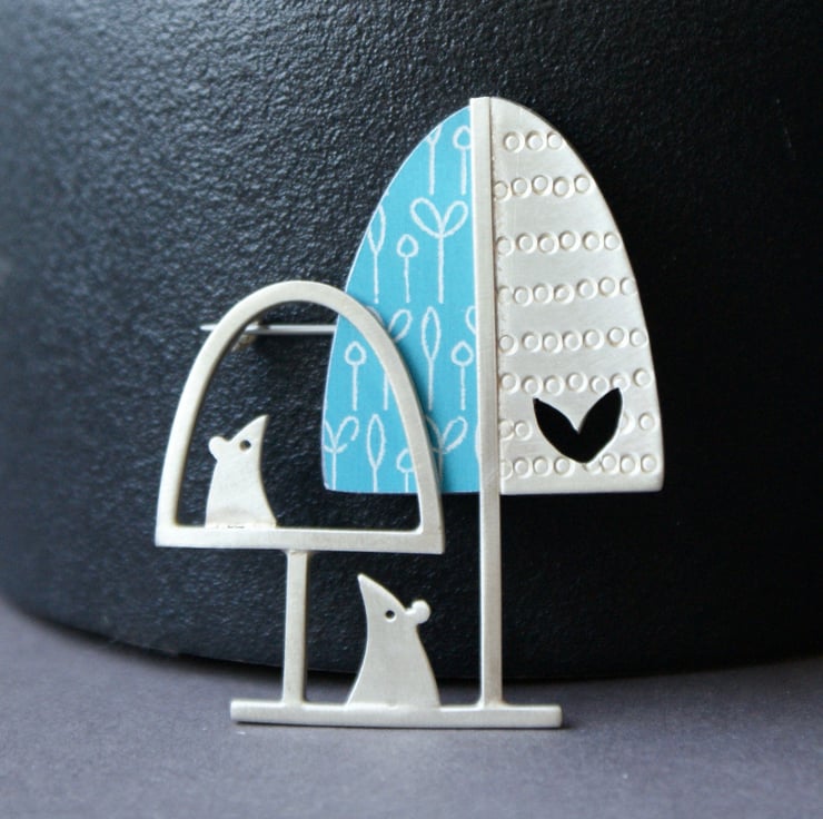 A cute brooch featuring 2 stylised trees and a 2 mice hand crafted from sterling silver and aluminium.