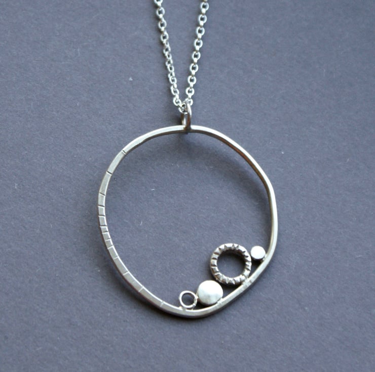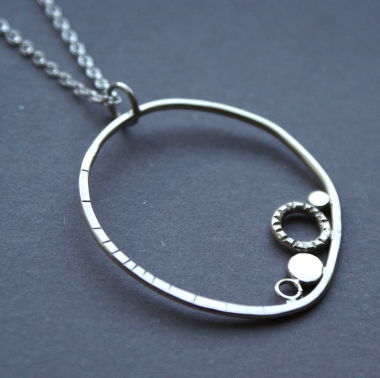 A lovely necklace hand crafted from sterling silver. The organic form is inspired by my sketches of shapes and patterns from the coast and features tiny silver pebbles and circles and some textured line details. The pendant is hung from an 18 inch chain.