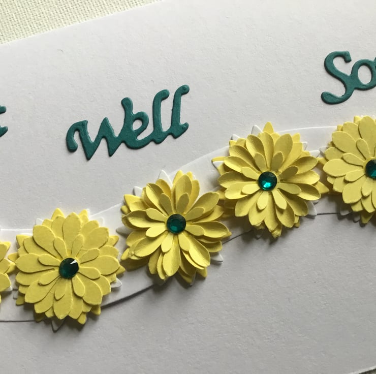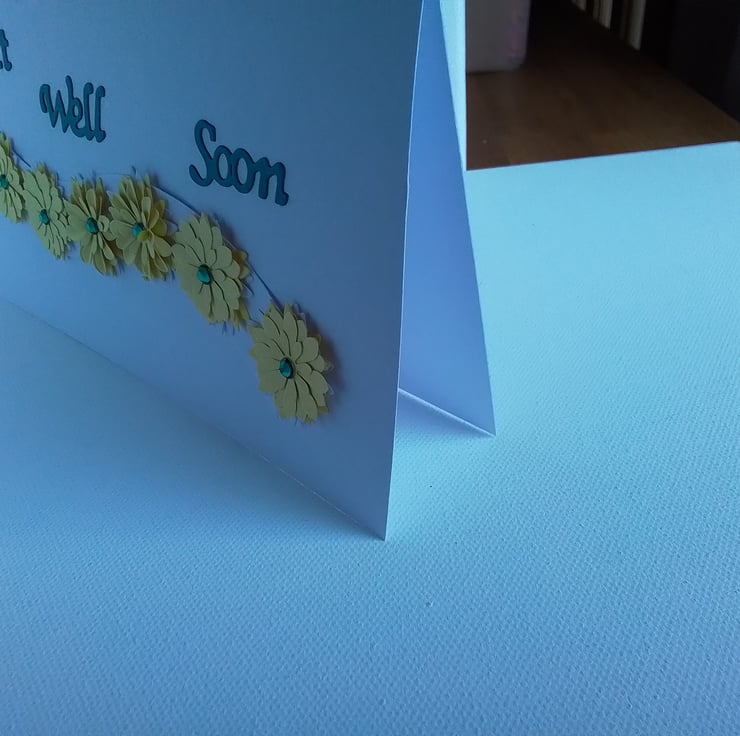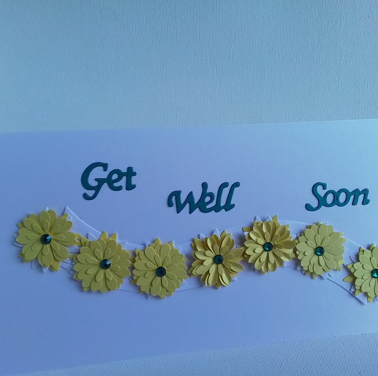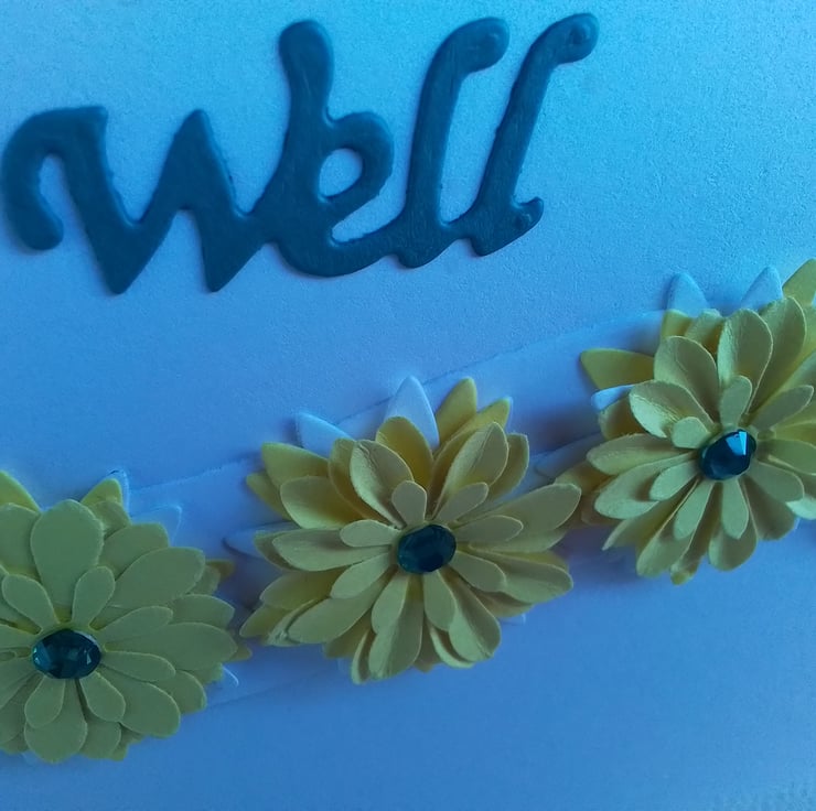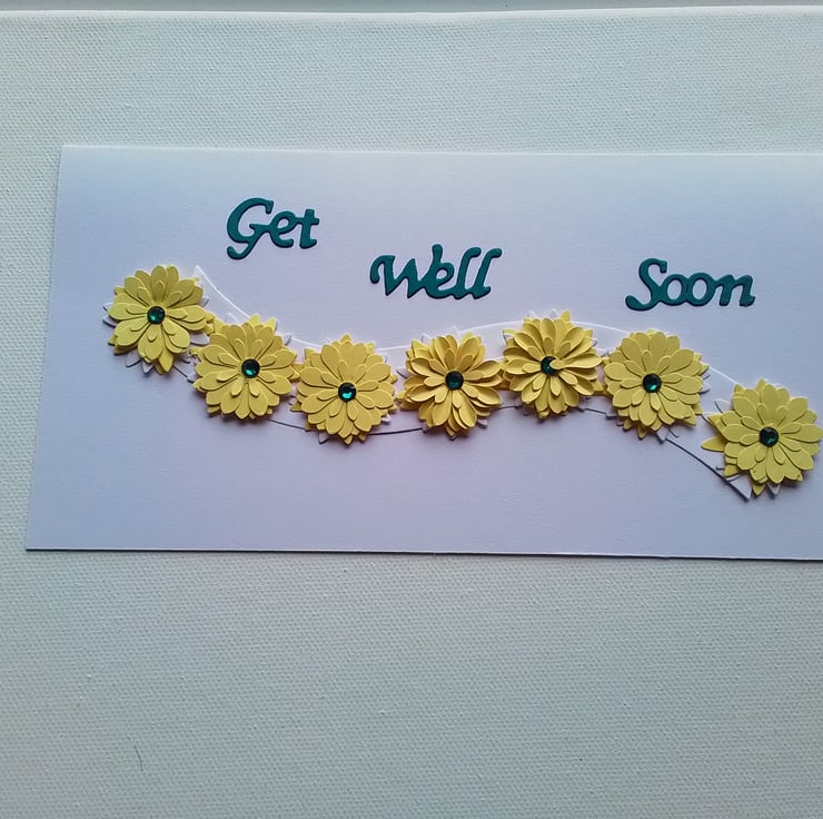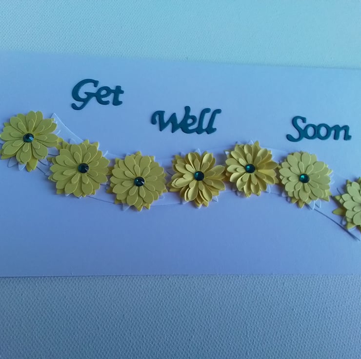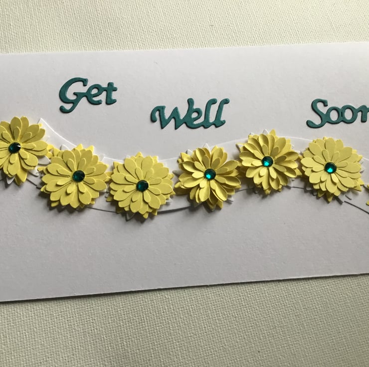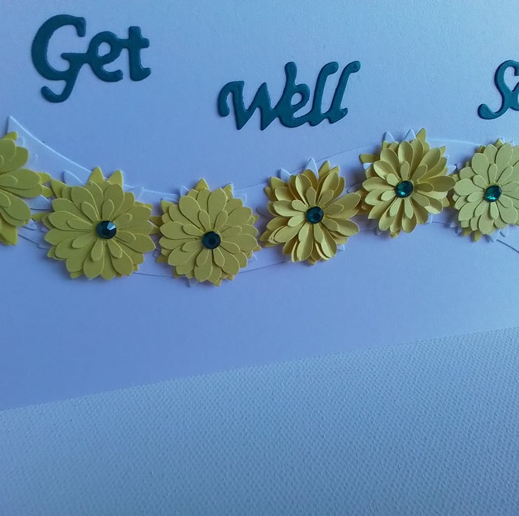 A pretty get well soon card with handmade yellow flowers and teal coloured beads and wording.