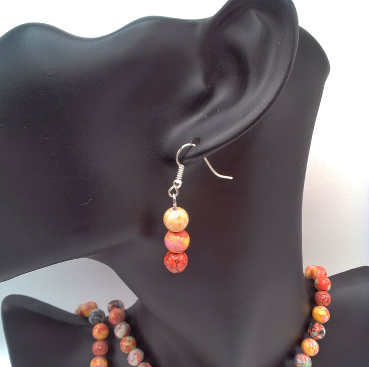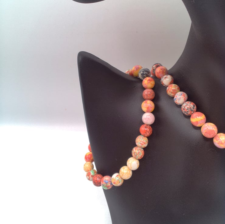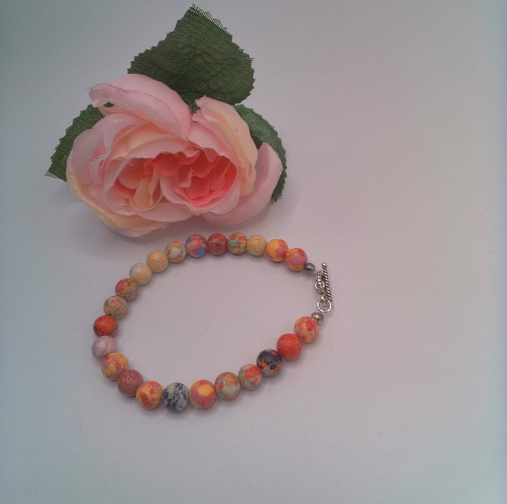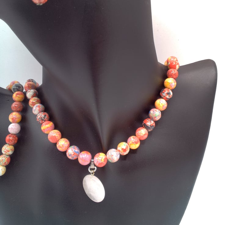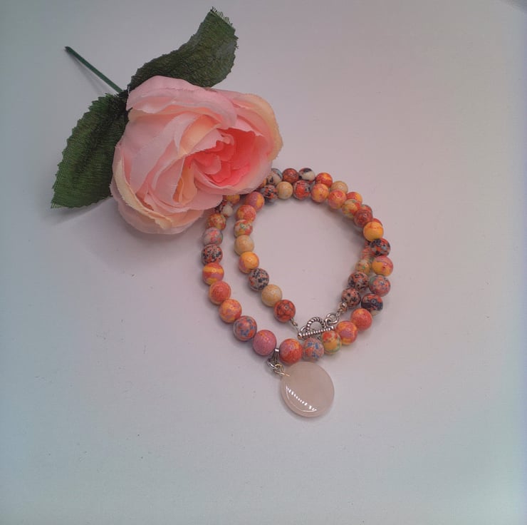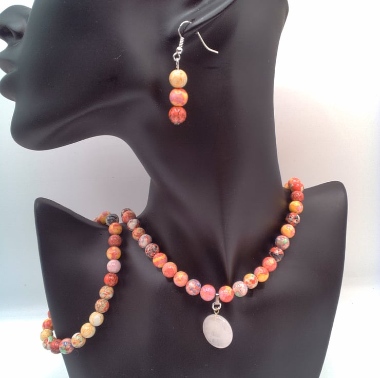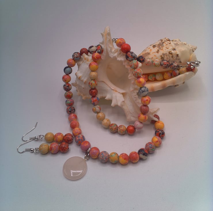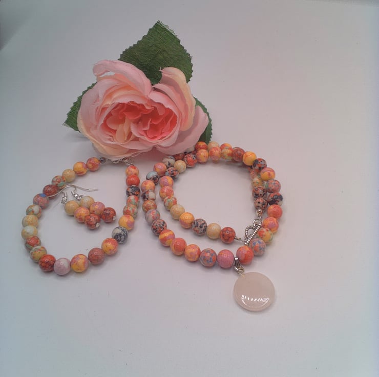 This very pretty jewellery set comprises a necklace with a pretty pink rose quartz circle pendant, a bracelet and a pair of earrings. It would look great to wear for a casual day out or evening out. The necklace is made using round 8 mm mottled pink beads with a 20 mm x 20 mm rose quartz circle pendant. It is fastened with a silver plated toggle clasp. The bracelet and earrings use the same beads as described above. The bracelet is fastened with a silver plated toggle clasp and the earrings have silver plated hook ear wires. The necklace is 17.75 inches (45.5 cm) in length, the bracelet is 7 inches (17.5) cm long and the earrings have a drop of 1.25 inches (3.5 cm) from the base of the ear wires. The jewellery set will be dispatched wrapped in tissue paper in an organza bag and delivered via Royal Mail first class post. The set would be a lovely gift for a fun loving lady.