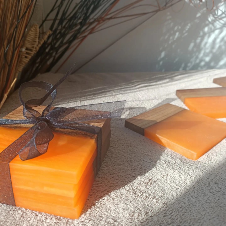 Beautiful solid Walnut wood with Grey resin. These coasters are handmade and have a live edge in the middle where resin meets the walnut.