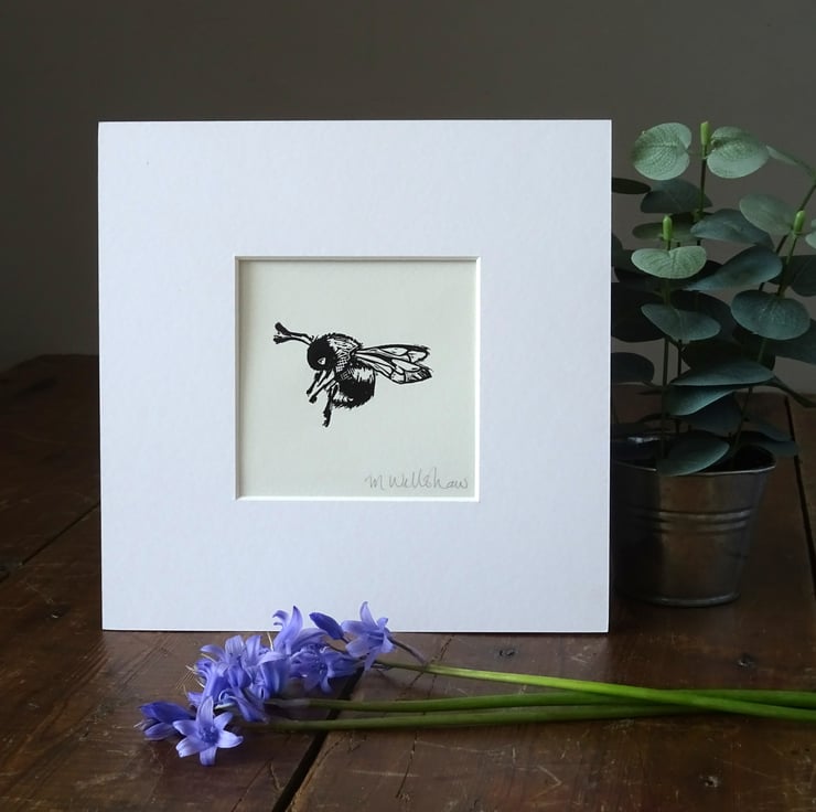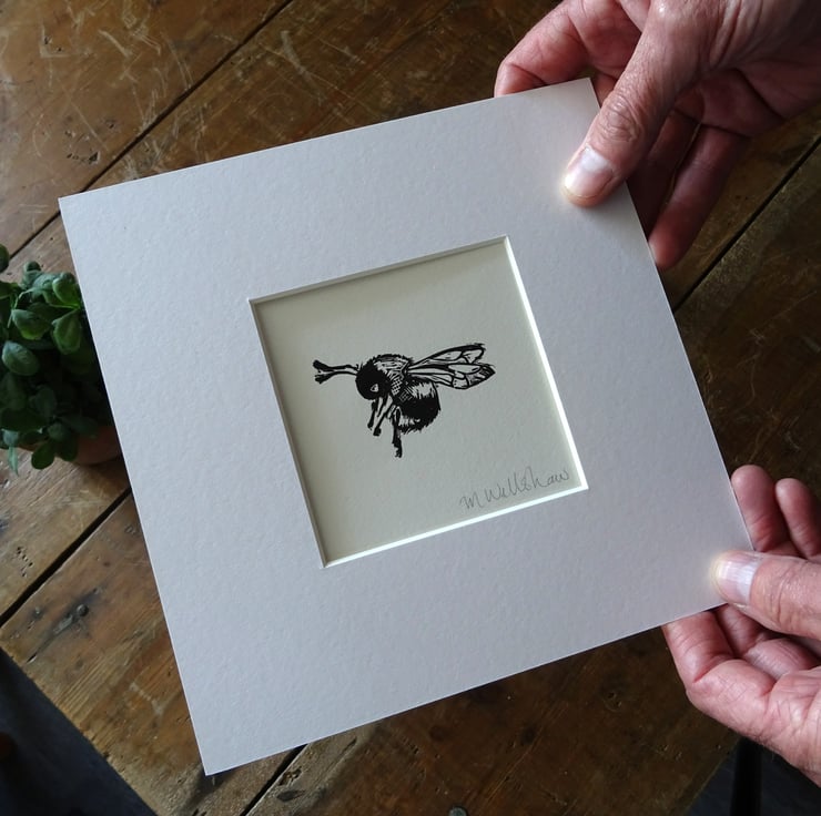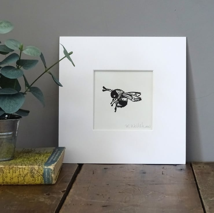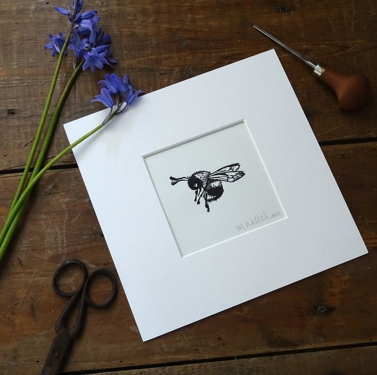 A mounted hand printed lino cut print of a cute bee. The perfect gift for bee lovers, bee keepers, or just for yourself.