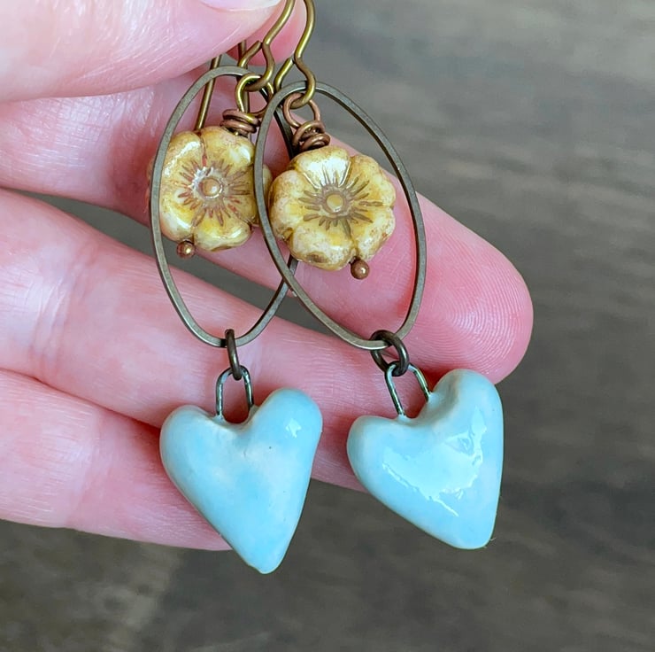 This charming pair of earrings feature heart-shaped ceramic charms crafted by bead artist Petra Carpreau. These handcrafted charms are beautifully glazed in a soft shade of aqua-blue.