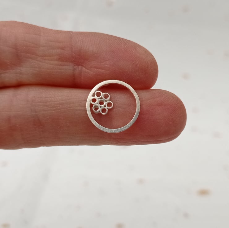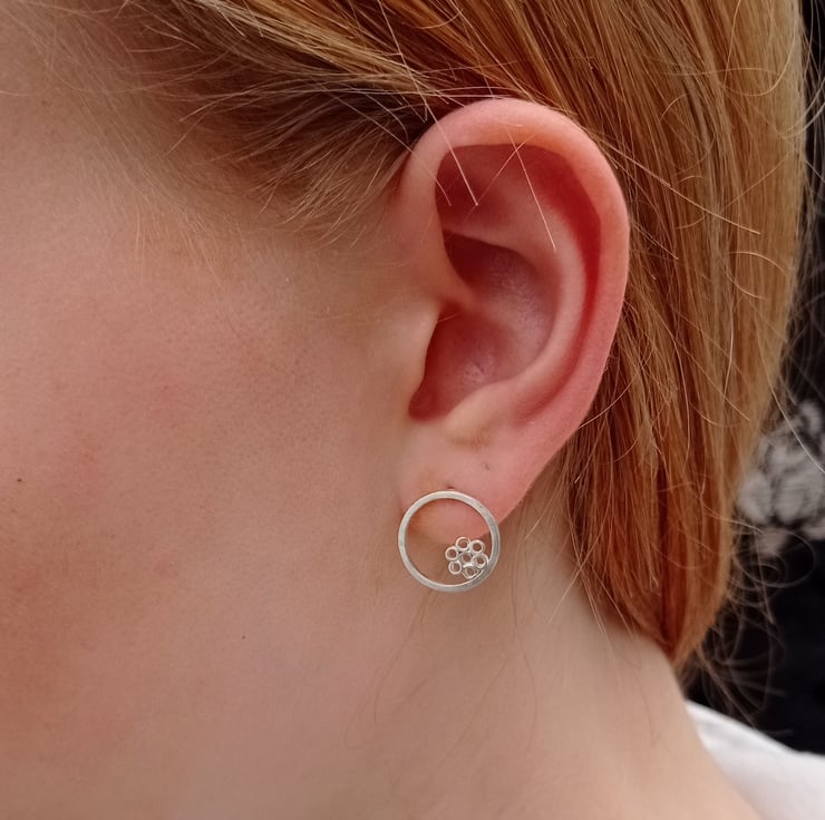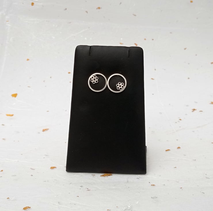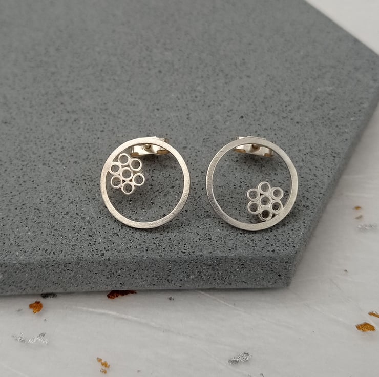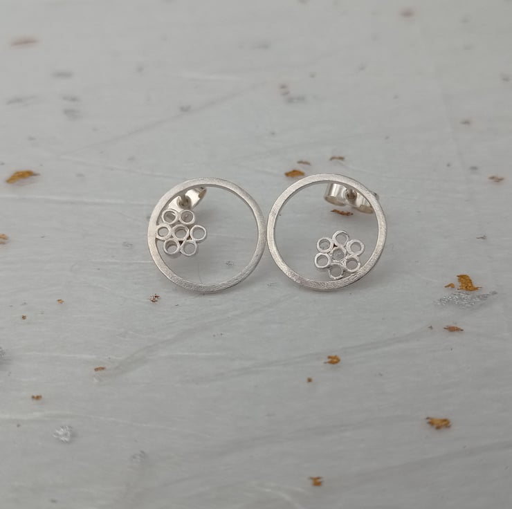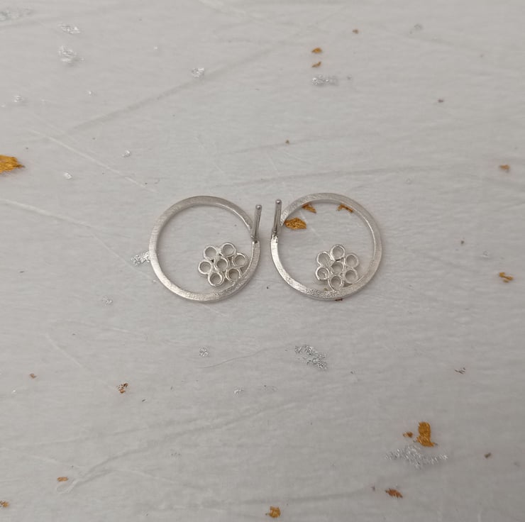 I have created these earrings by using recycled sterling silver square wire and tube. The tiny tubes have been soldered together to create flower shapes, these were then soldered inside the wire circles. Sterling silver ear posts were soldered to the backs and the earrings were given a brushed wire finish. They are part of a small collection of similar necklaces and earrings.