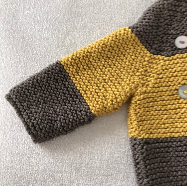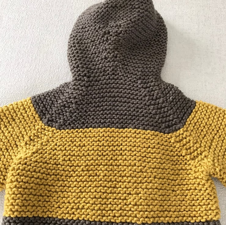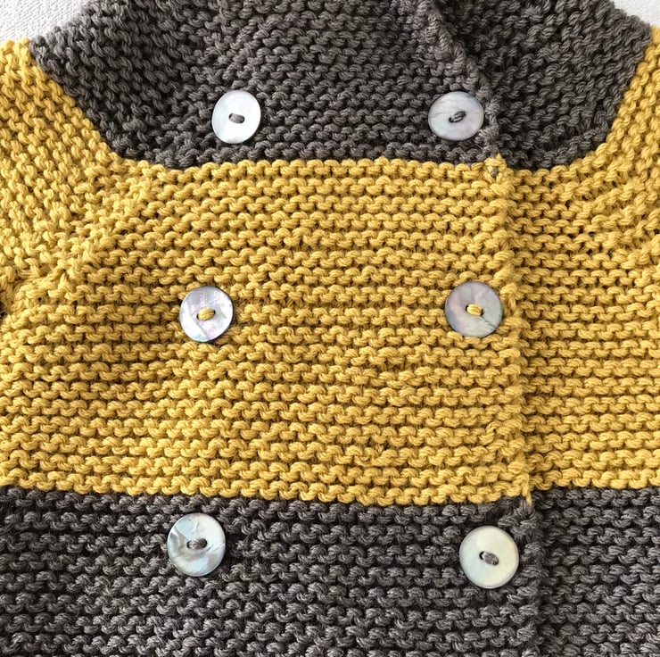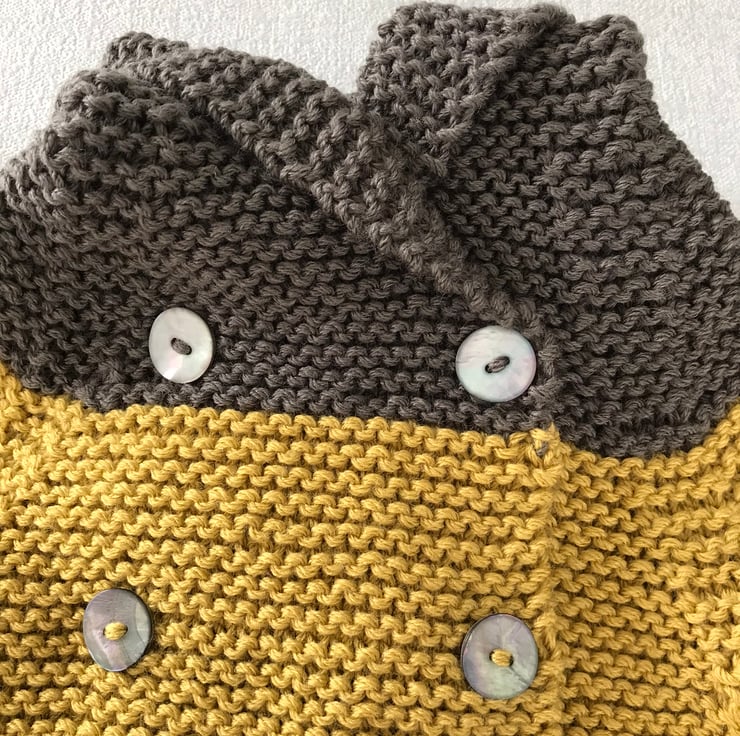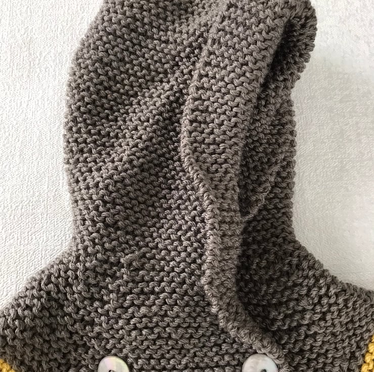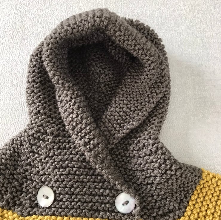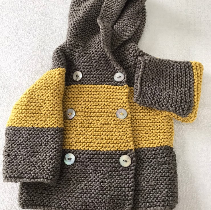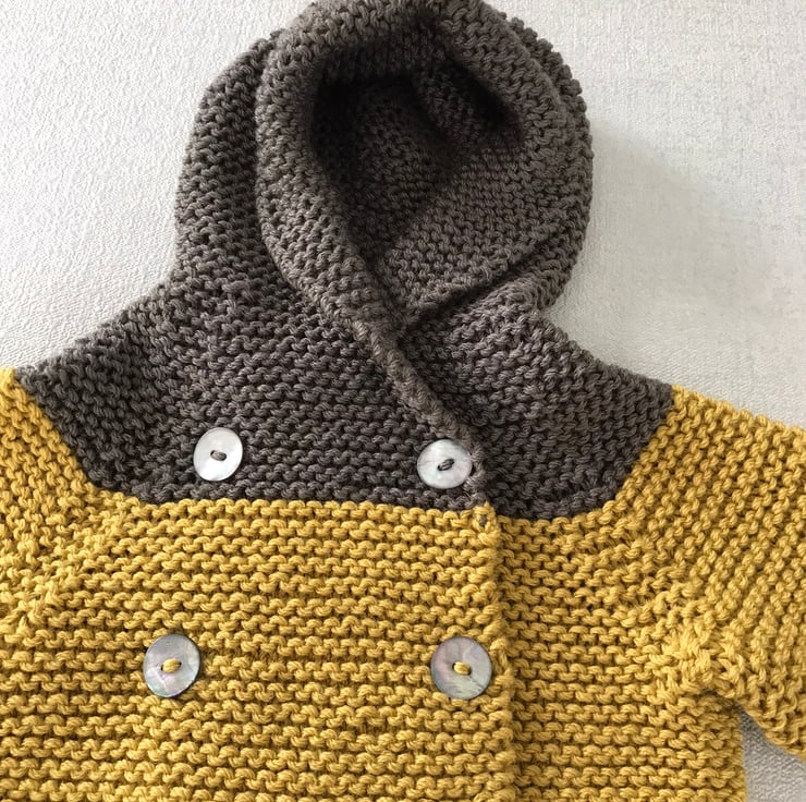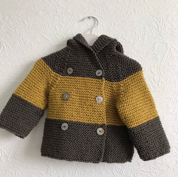 This lovely jacket is hand knitted in an Aran weight yarn. It is worked in garter stitch in two contrasting colours - mustard and dark brown. It is double breasted and fastens with six mother of pearl like buttons. The hood is folded back at the top giving it a shawl like look at the neck.