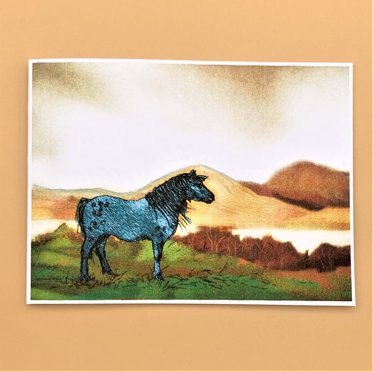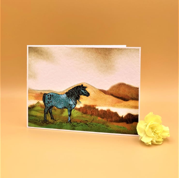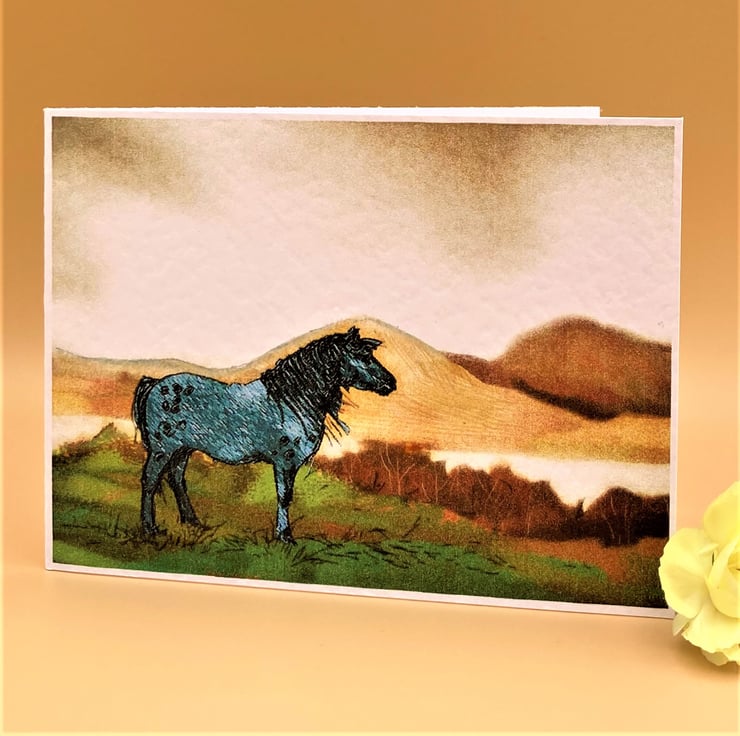This blank greetings card of a little blue roan pony in a golden brown mountain landscape is a lovely way to send any message. The card is great for any occasion but I think horse and pony lovers will especially appreciate it. Taken from one of my originals I have manipulated the main image and combined it with different digital elements to create a whole new painting.