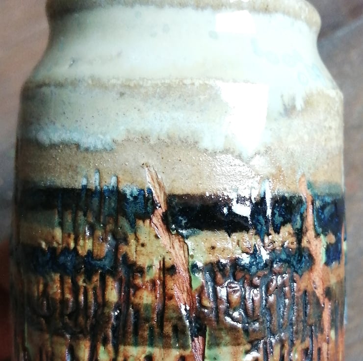 The mix of oxide and glazed areas, create matt, satin and a glossy feel to the surfaces of the completed vases.