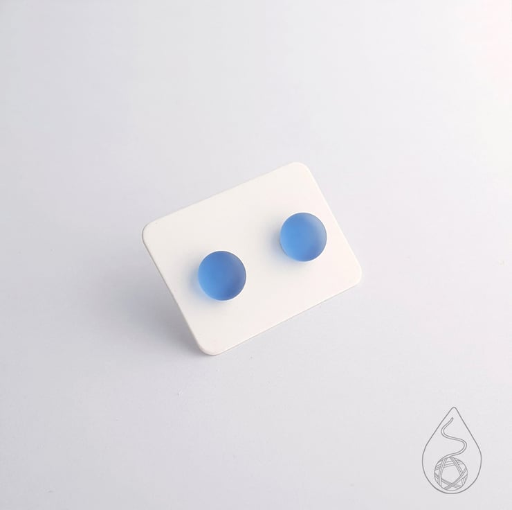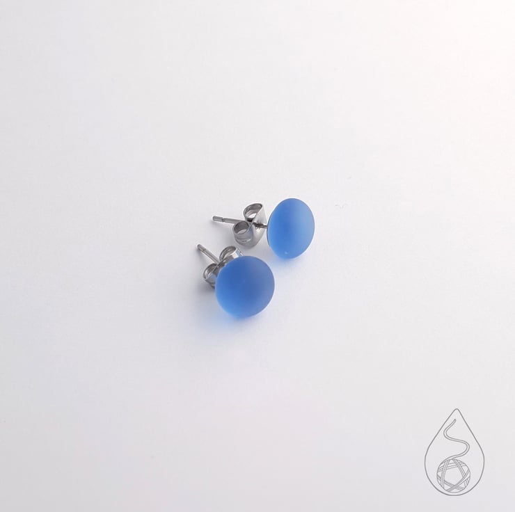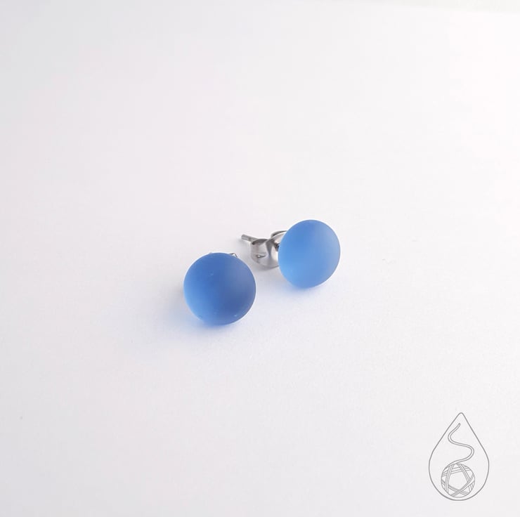 Small amounts of glass are fused at high temperatures in a kiln to create round droplets of glass. These are then securely attached to surgical steel earring posts with butterfly backs. This pair has been tumbled etched to give a soft, matt finish almost like sea glass.