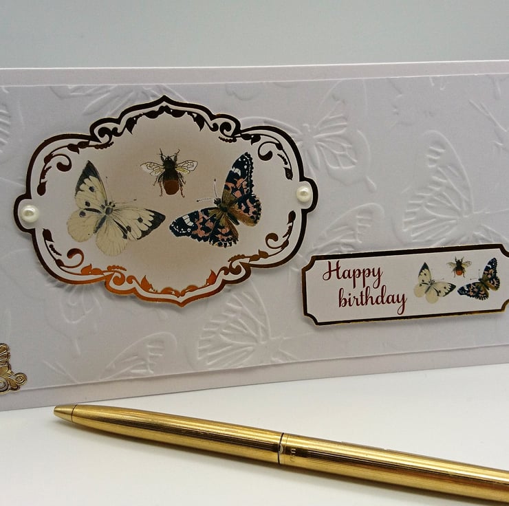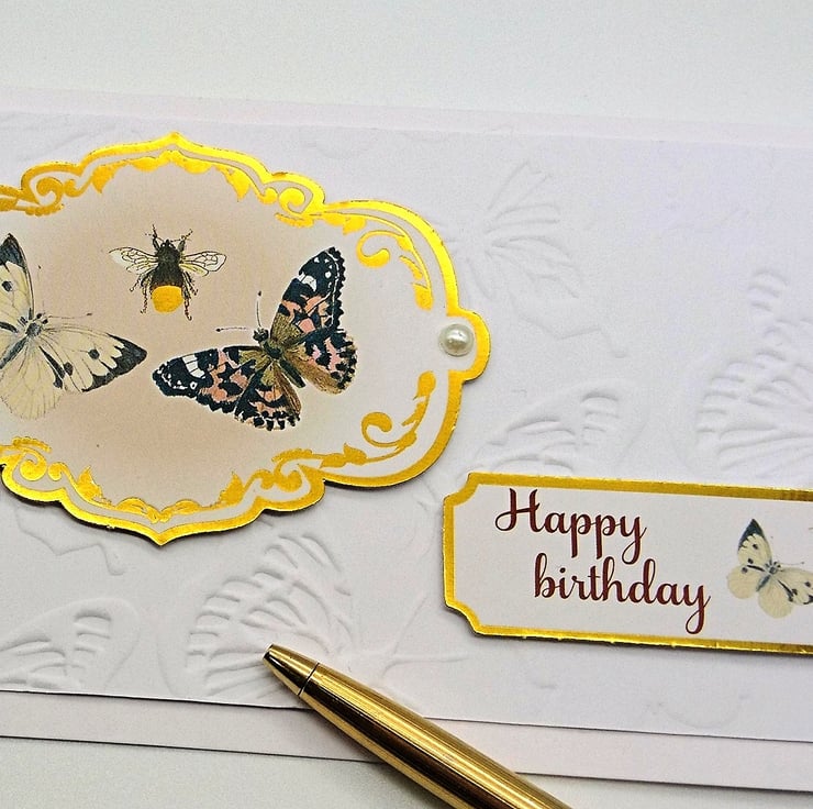 This handmade birthday card is layered with a beautiful white embossed butterfly background, with four ornate gold corners. Then topped with raised butterflies and bee design from Edith Holden's Country Diary of an Edwardian Lady. Completed with matching gold edged Birthday sentiment and two white pearl gems.. All Heart To Soul Cards are handmade with love, in my wee studio in Dunoon, Argyll Scotland.