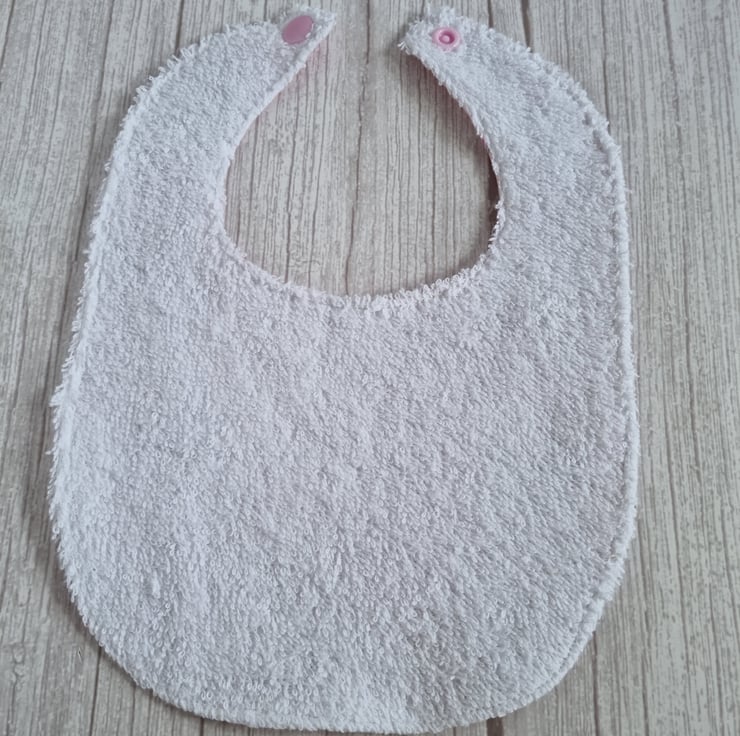 Bib - a traditional style bib, with a matching popper closure in the same pretty print fabric, backed with soft white towelling.