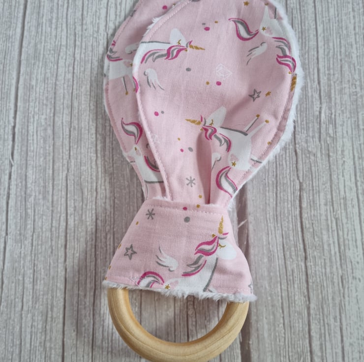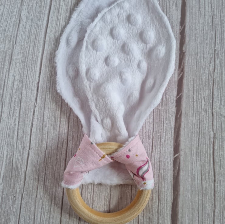 Bunny Ear Teether - fabric "bunny ears" in the same print, backed with soft white dimpled fleece, tied to a 70cm untreated, unvarnished wooden teething ring. The fabric is easily removed for washing and the teething ring is too large to be a choking hazard.