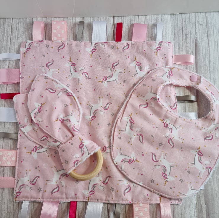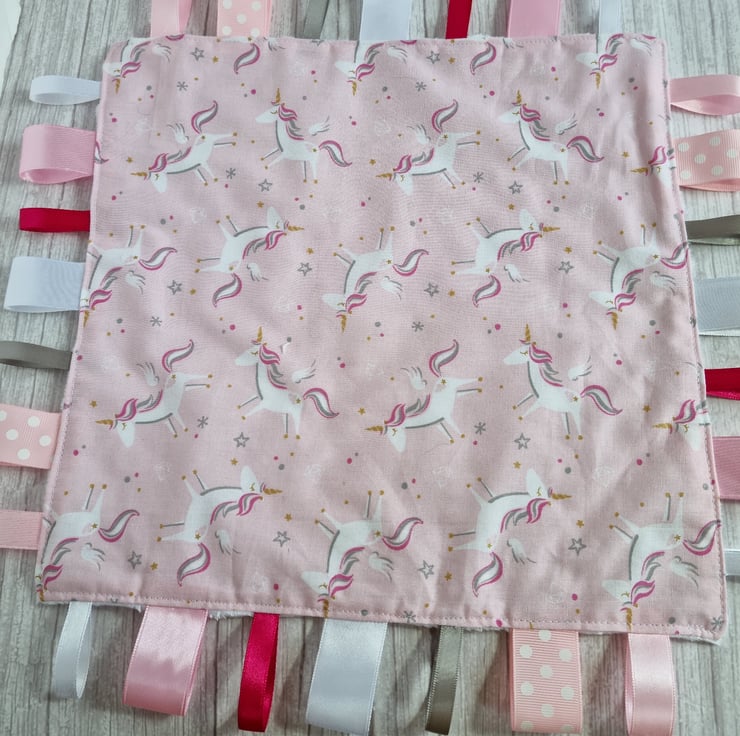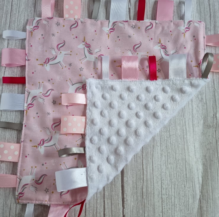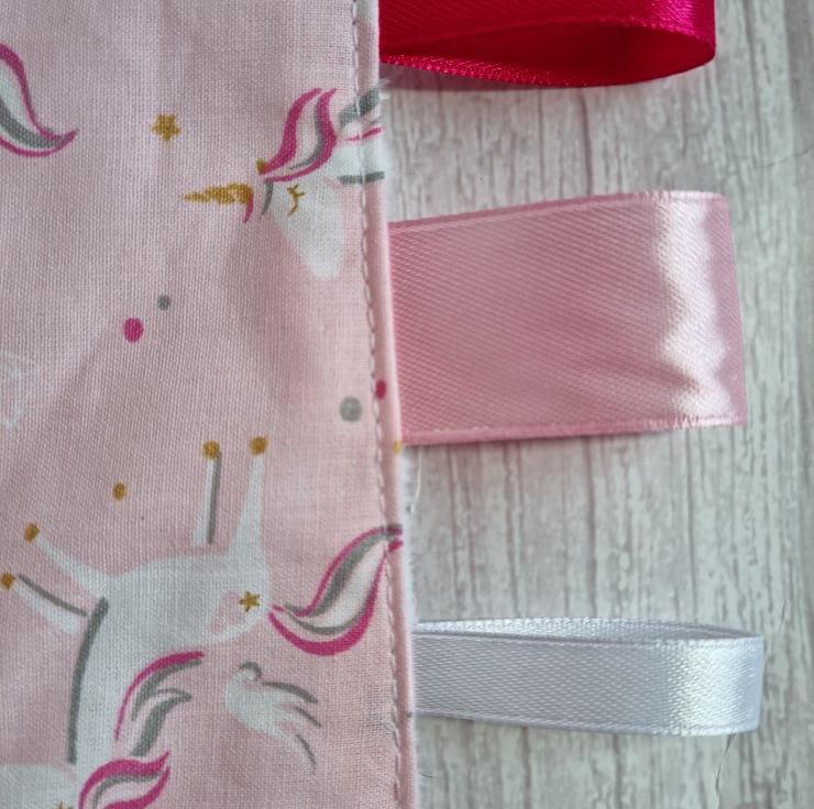 Taggy blanket - pretty pink unicorn print fabric on one side and snowy white dimpled fleece on the other. There are seven looped ribbons of different sizes and textures on each side, triple-stitched for safety.