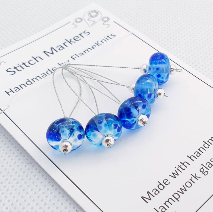 A set of 5 stitch markers made with lampwork glass beads in shades of blues.
